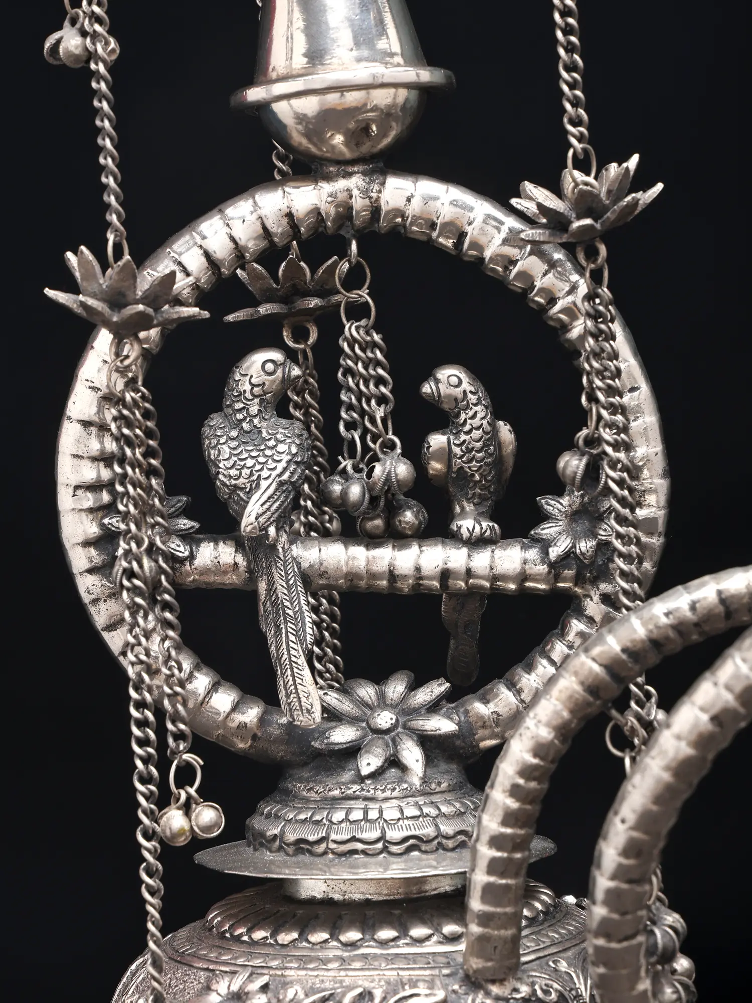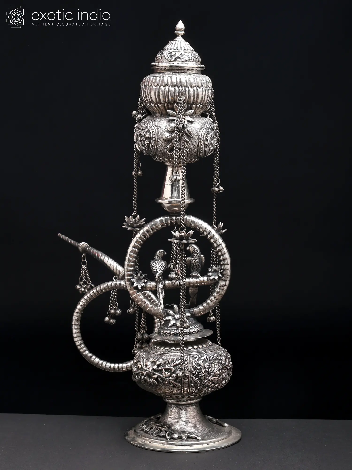 Standing an impressive 21 inches tall, this piece commands attention with its commanding presence. Its intricate detailing, from the delicate chains that cascade like jewelry to the charming sculpted birds perched within a decorative motif, creates a visual narrative. The substantial 16-inch width and 6-inch length provide a sense of balance and gravitas, making it a truly impressive object.