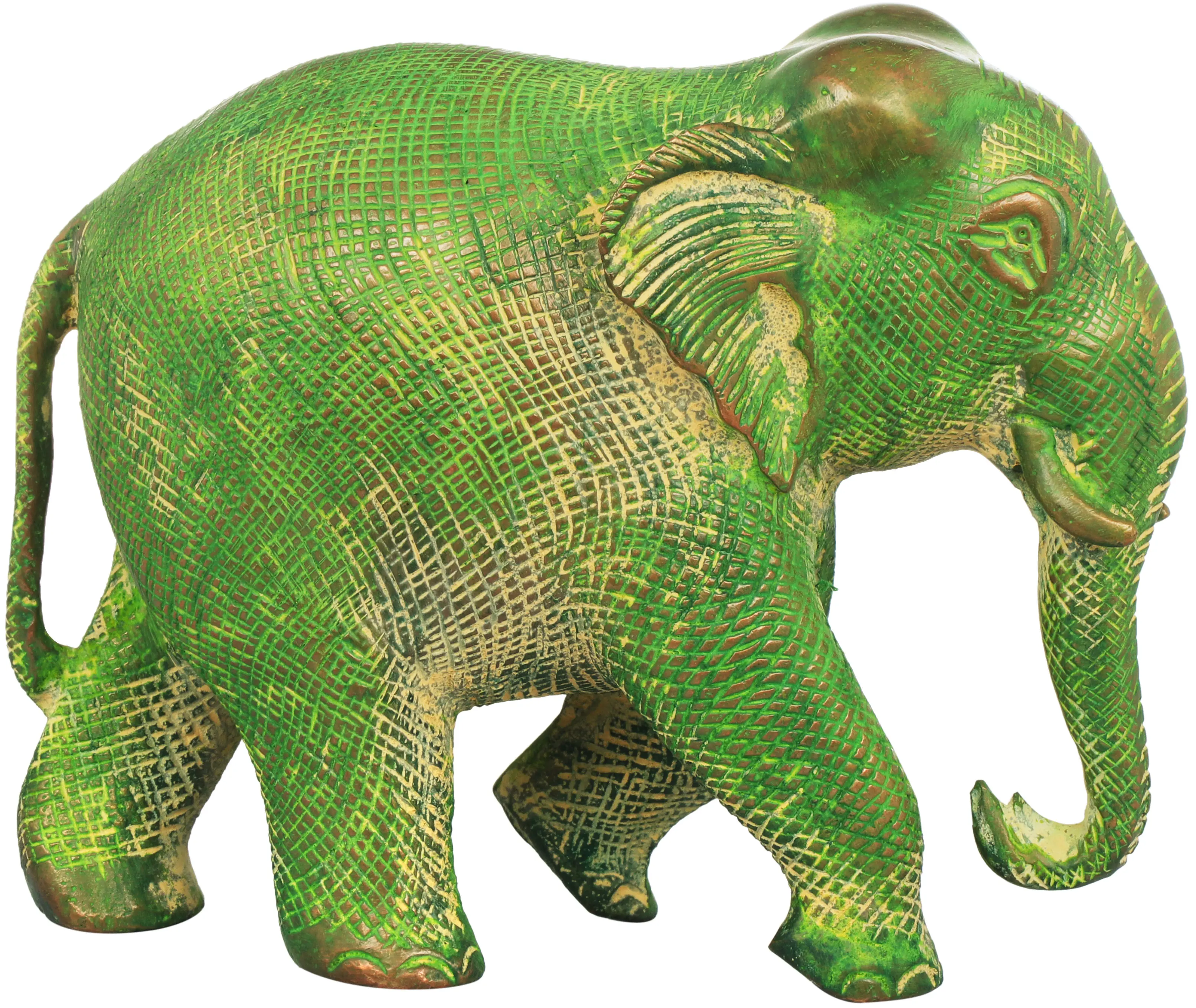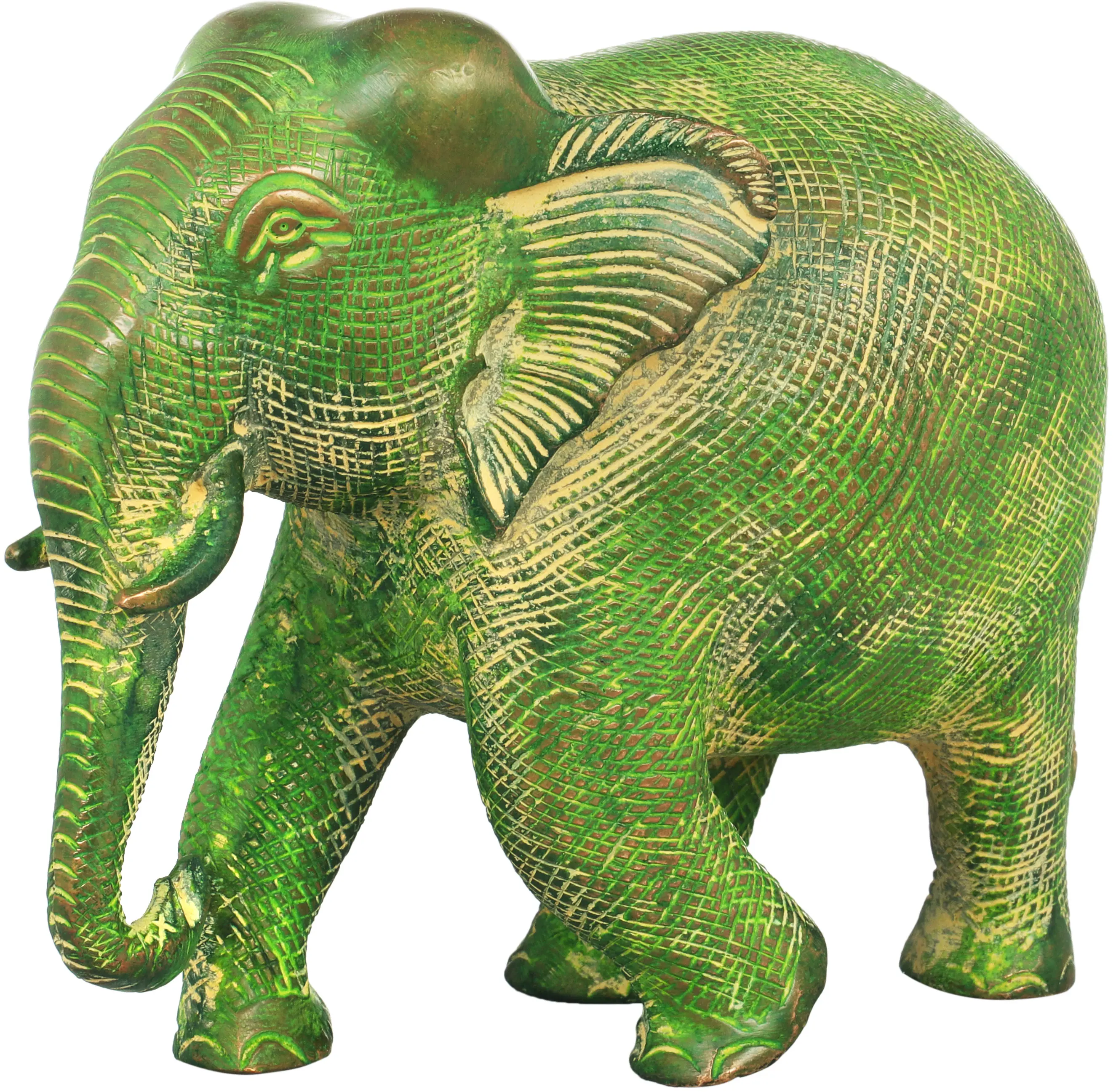 This Elephant, in brass, is adorned with diagonal lines that make a Jaal pattern on the statue's body. The smart green patina for the elephant's body and yellow lines to depict the pattern give the statue a unique look. This pachyderm, a living artifact, is a testament to the dance between nature and craftsmanship. Here, the elephant is depicted walking in grace, thus symbolizing the majesty of the animal, which is also the vehicle of Lord Indra and closely associated with the God of good luck, Lord Ganesha.
