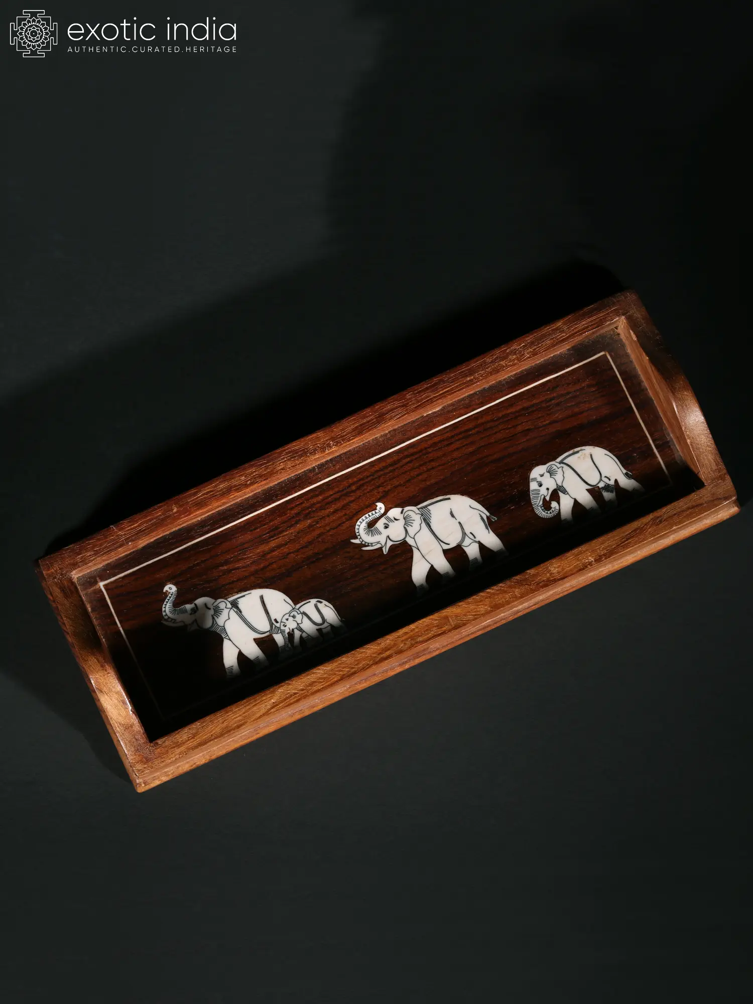 This Elephant Design Inlay Art Rectangular Teakwood Tray is a functional piece that attempts to preserve traditional artistry. It depicts an elephant design in white inlay work, showcasing the enduring legacy of traditional craftsmanship. The tray's functionality extends beyond serving to become a canvas for intricate art. Each stroke and detail reflect a dedicated effort in preserving and celebrating cultural heritage.