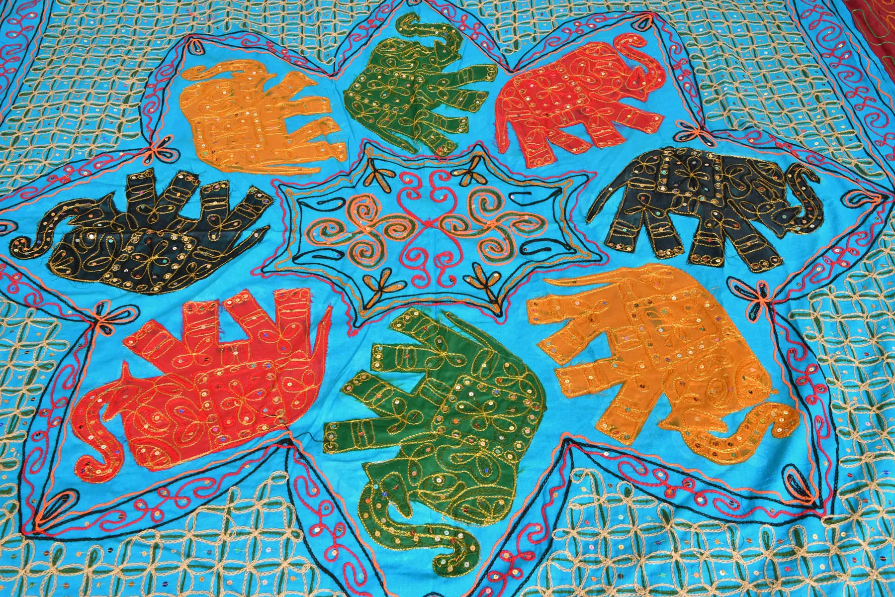 Gujarati Bedspread with Applique Elephants and Embroidered Sequins