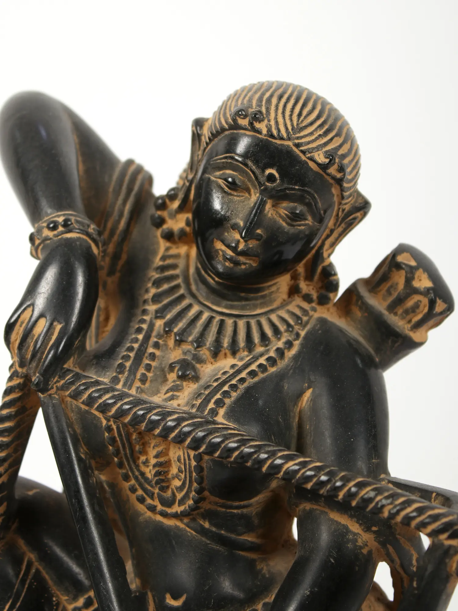 Labeled as “Madanika” or divine females, sculptures of Indian women with bows and arrows in valiant and athletic poses have been discovered on the walls of ancient Indian temples. This female archer statue, sculpted from the aesthetic black stone, draws from the visual tradition of women warriors.
