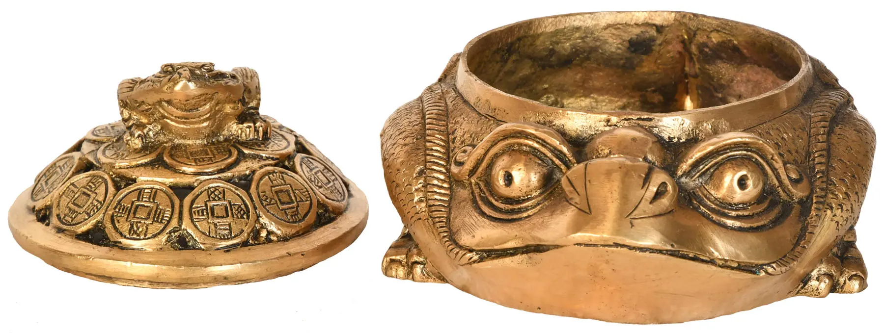 Every detail of this unique piece is imbued with symbolism. The frog, a revered creature in many cultures, is often associated with wealth and longevity. The coins encircling the frog are visual representations of prosperity and financial stability, reinforcing the object's intent to attract abundance. Cast in brass, this piece showcases incredible detail, from the textured skin of the frog to the intricate patterns on the coins. The rich, golden hue of the brass exudes warmth and elegance, adding a touch of luxury to any room. The design incorporates subtle vents that allow the fragrant smoke to escape gently, creating a mesmerizing visual effect as it fills the air.