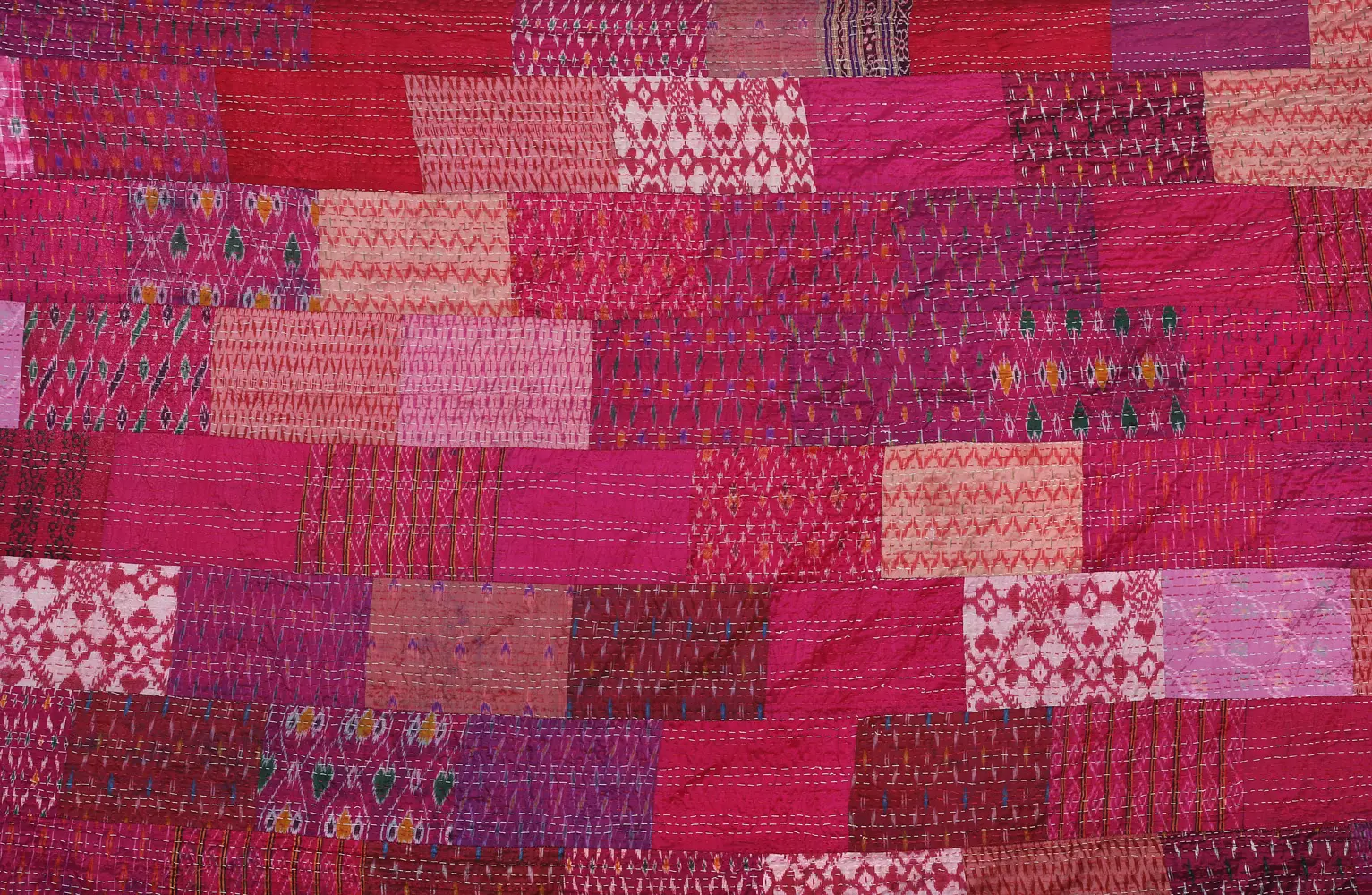 The bedspread features a captivating arrangement of printed floral patchwork, where varying patterns and textures come together in harmonious chaos. The floral motifs evoke a sense of nature's beauty, brought indoors. The dominant fuchsia palette bursts with life, accented by complementary shades that add depth and visual interest. The entire piece is meticulously adorned with Kantha stitch, a traditional embroidery technique that adds both textural richness and reinforces the durability of the bedspread. The running stitch creates subtle, undulating lines across the surface, further enhancing the handcrafted aesthetic.