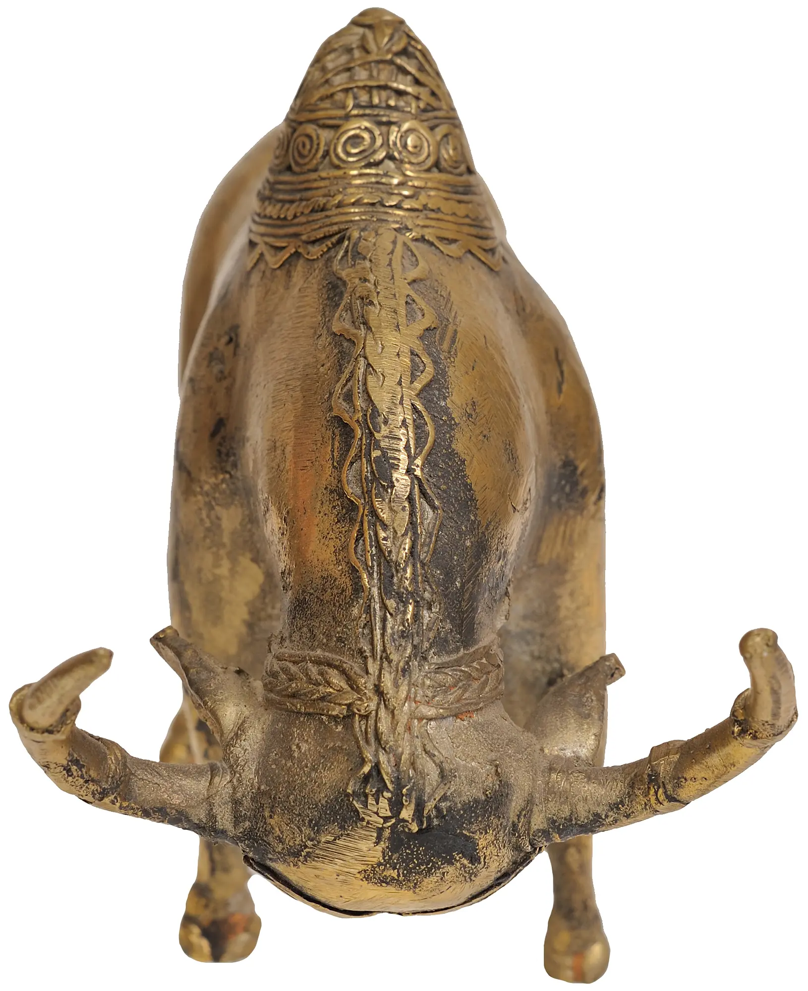The brass material lends a warm, golden hue to the sculpture, adding to its visual appeal. The surface is not perfectly smooth but rather exhibits a subtle texture, indicative of the artisan's touch and the casting process. This contributes to the statue's character, adding depth and an appealing, subtly aged feel. The details adorning the bull's back further enhance its unique charm. The intricate designs create a mesmerizing visual element that draws the eye and begs closer inspection.