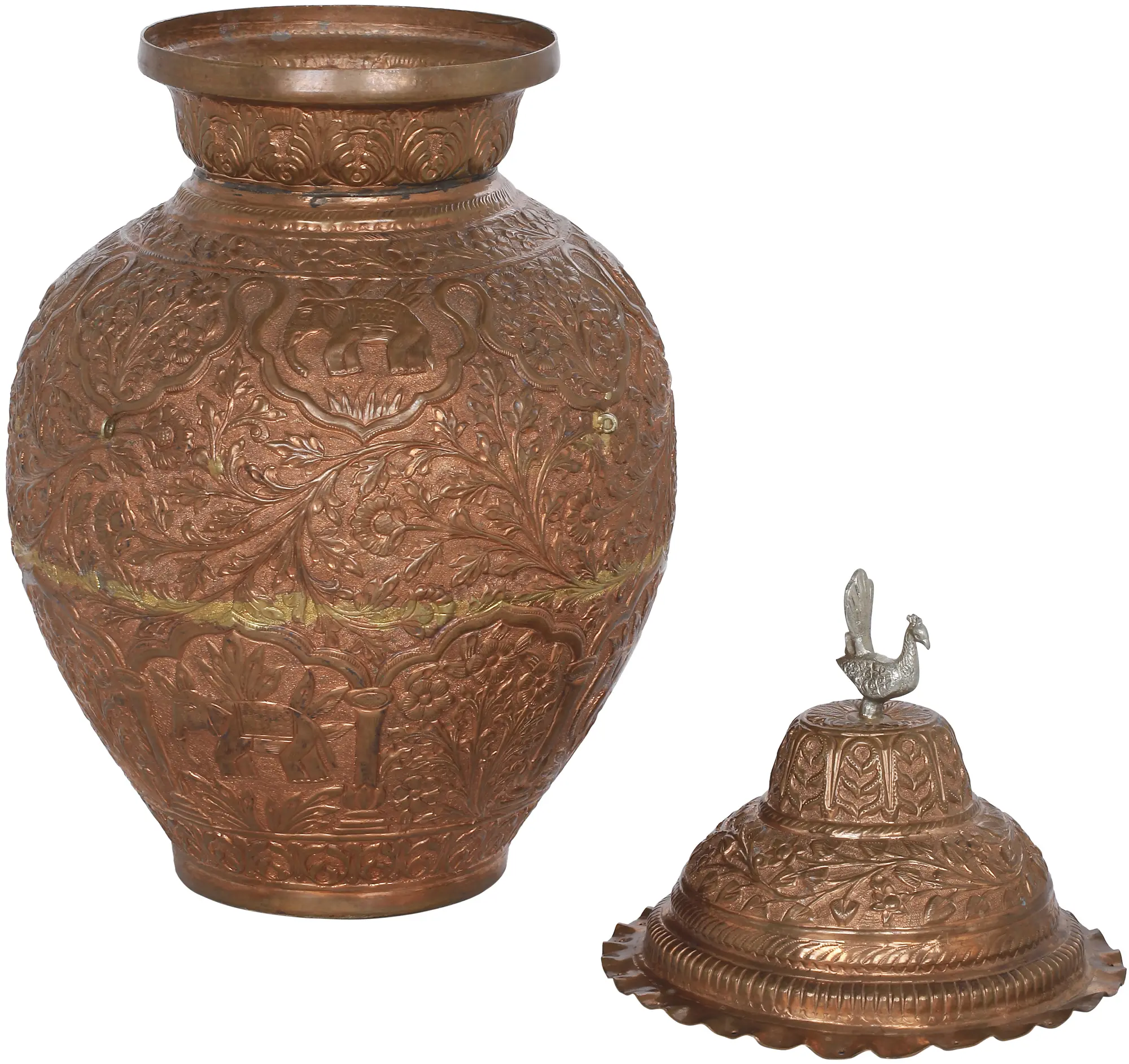 The intricate surface of this piece is a visual feast. Skilled artisans have painstakingly adorned every inch with a captivating array of motifs. The majestic elephants, rendered with remarkable detail, evoke a sense of strength and grace. These animal figures are interwoven with delicate floral patterns, forming a harmonious tapestry that draws the eye. Each element is carefully considered, resulting in a piece that is both visually stunning and rich in symbolism. Observe carefully and find delight in the hidden details.