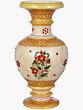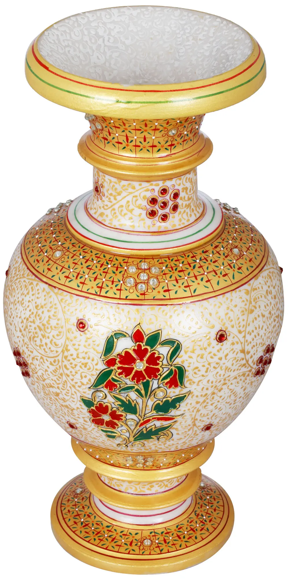This magnificent vase showcases meticulous craftsmanship, evident in every curve and detail. The vase is carved from marble, known for its inherent beauty and durability. The smooth, cool touch of the stone adds a sense of luxury and permanence. Furthermore, the artist has hand-painted ornate flower motifs throughout the body of the vase, with an accentuation on the larger stylized blossom designs. Tiny gems further accentuate these blossoms. These designs infuse the vase with character and create an eye-catching visual display. The gold accents perfectly complement the marble's pristine hue, creating a harmonious blend of color and texture.