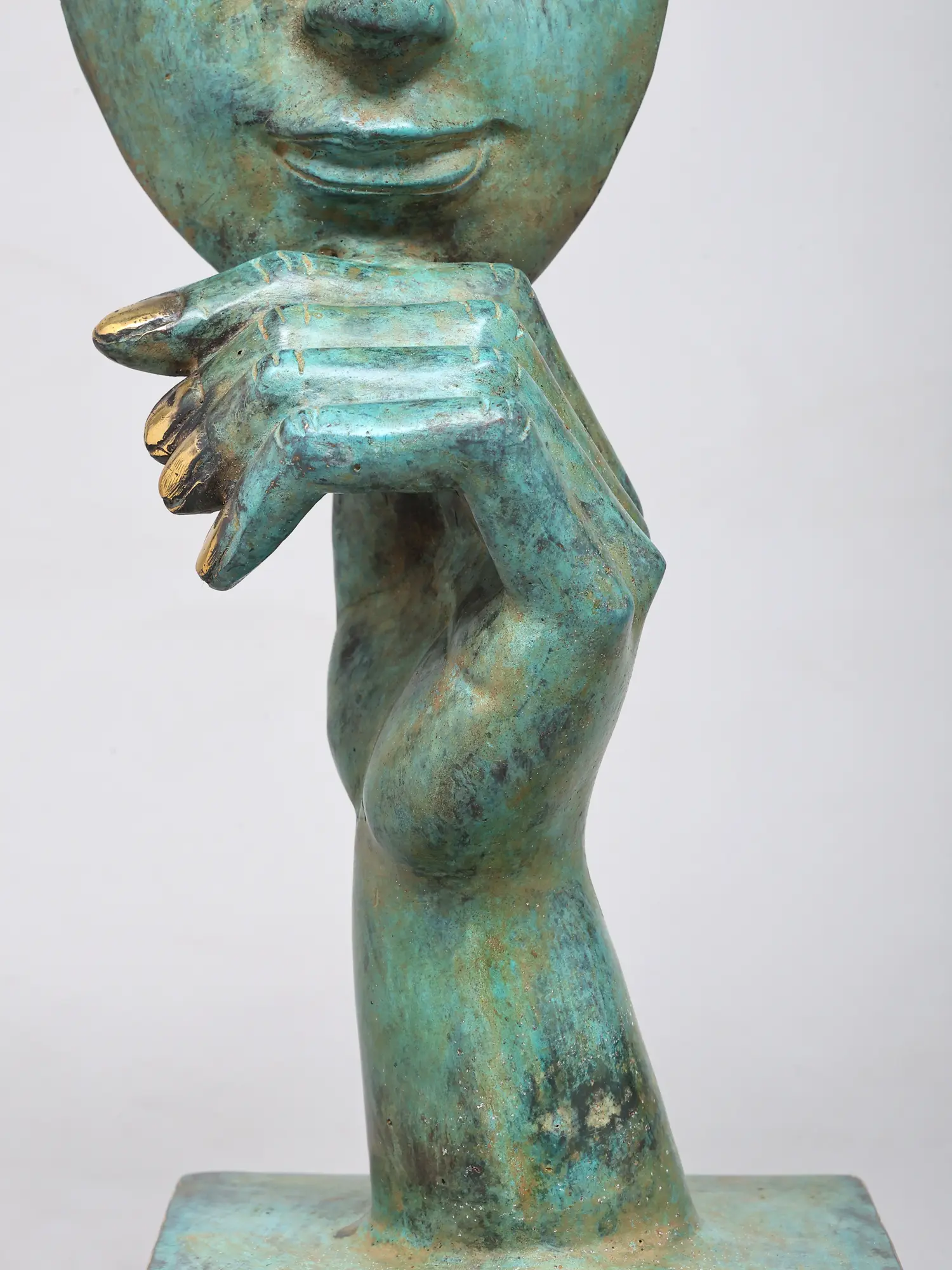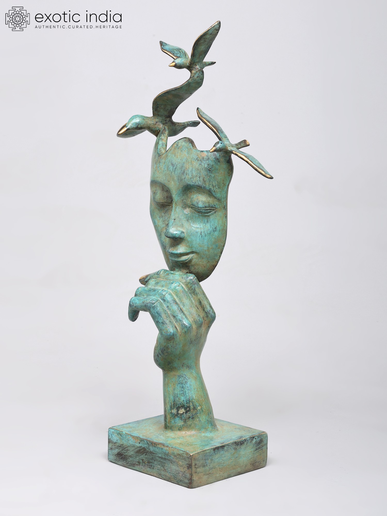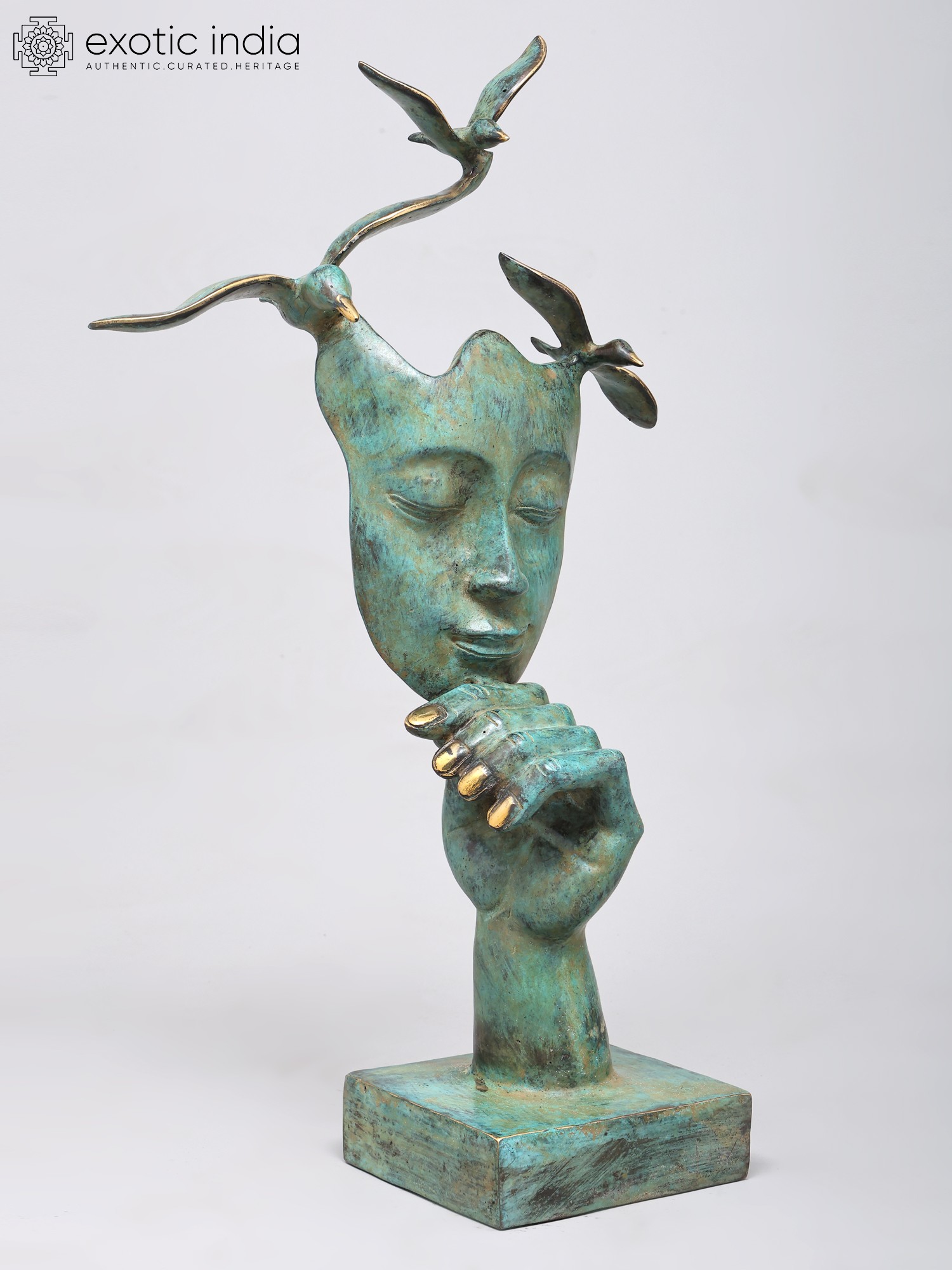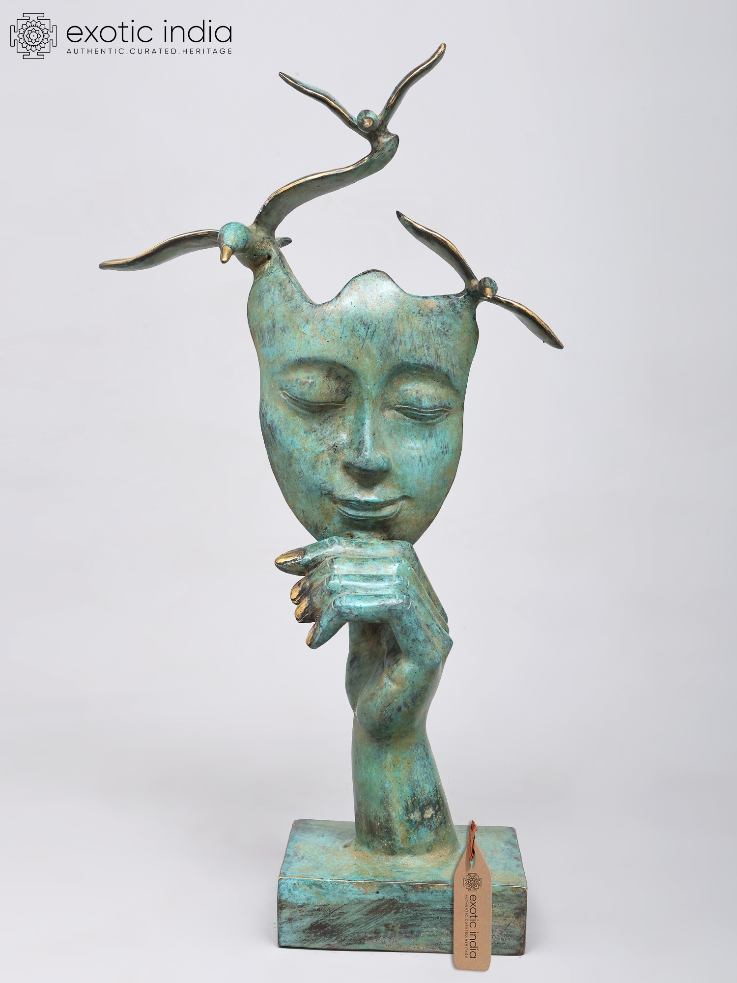 The verdigris patina gives the figure an aged, dreamlike quality, hinting that imagination is both ancient and ever-renewing. Gold-tipped details on the birds and fingers add a touch of luminosity, suggesting sparks of insight emerging from quiet reflection.