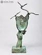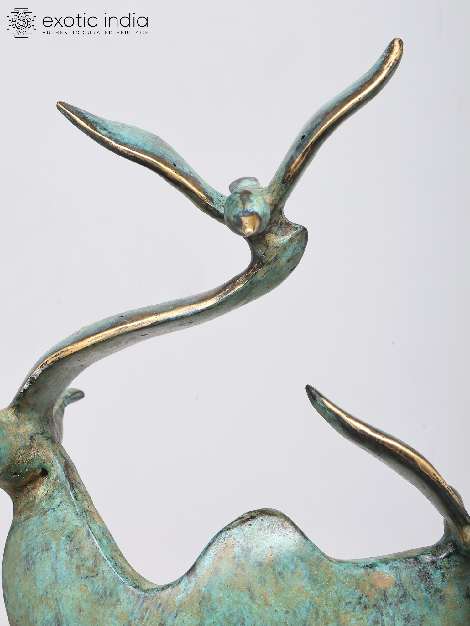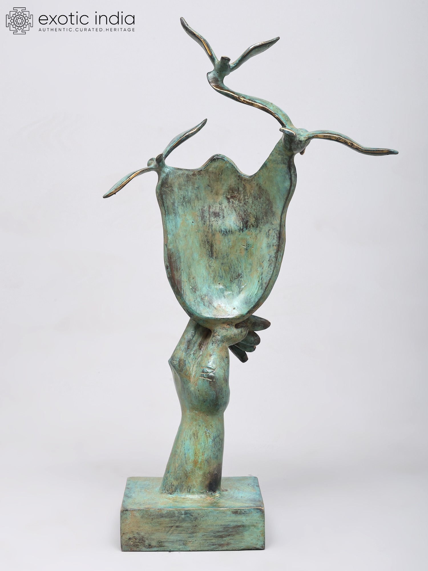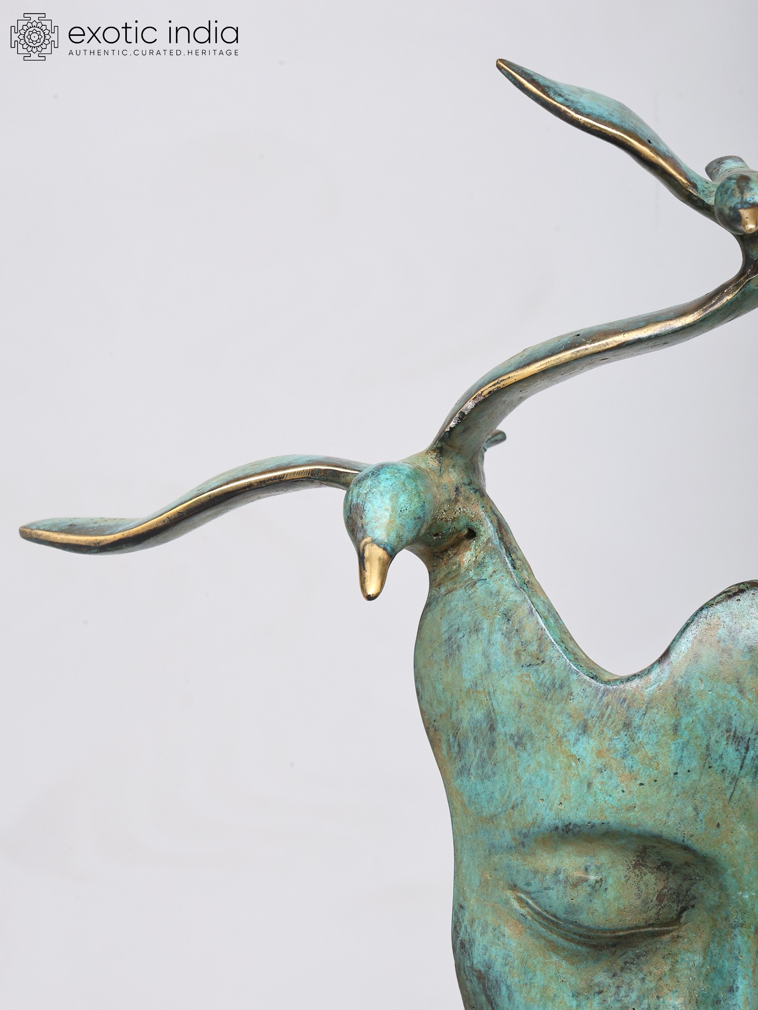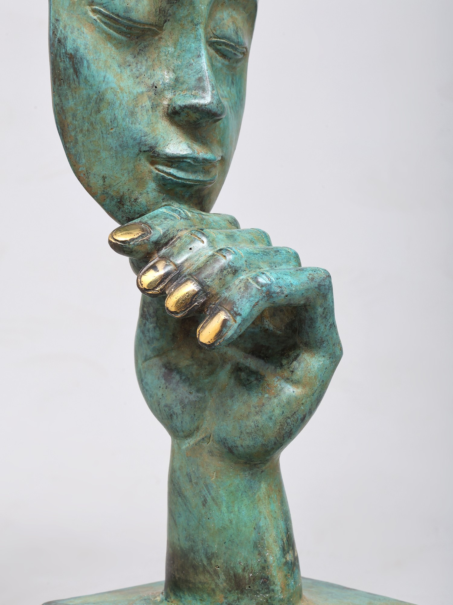 The verdigris patina gives the figure an aged, dreamlike quality, hinting that imagination is both ancient and ever-renewing. Gold-tipped details on the birds and fingers add a touch of luminosity, suggesting sparks of insight emerging from quiet reflection.