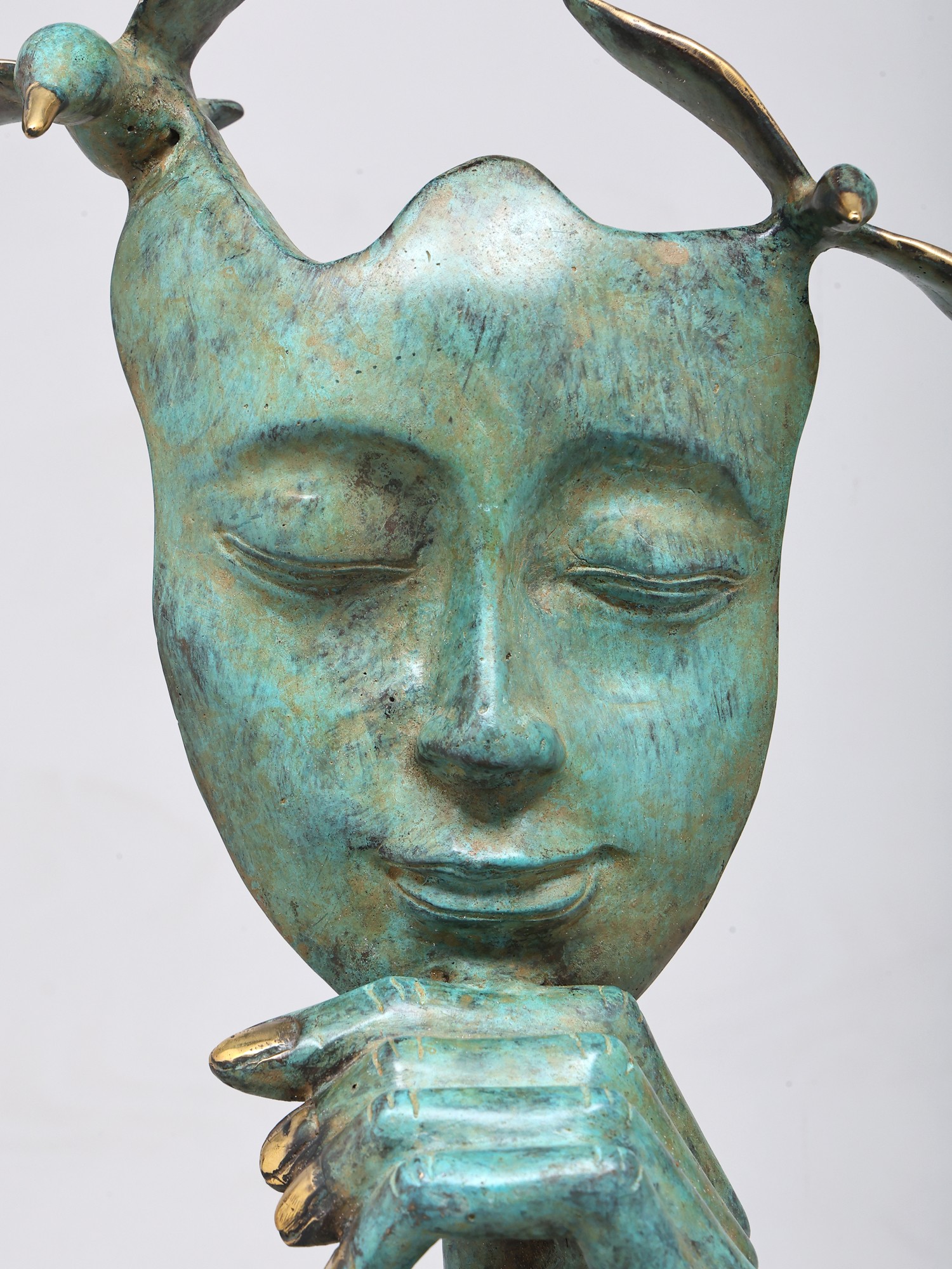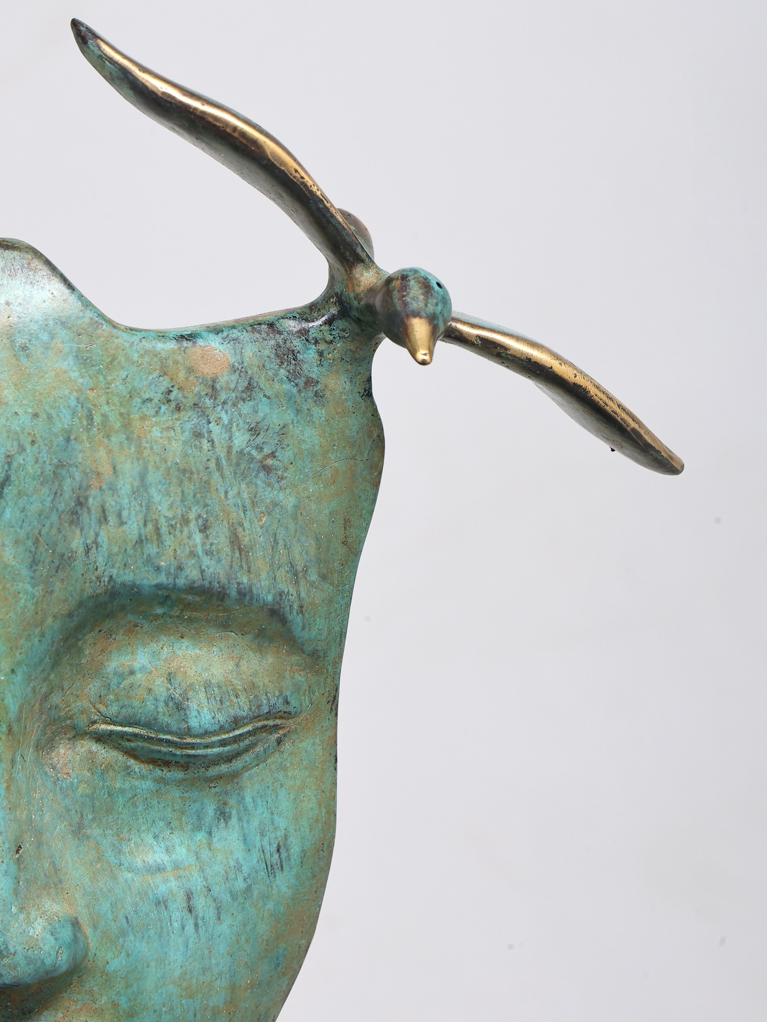 This sculpture holds a delicate duality at its core: the serene stillness of the face and the sweeping motion of birds emerging from the head. Eyes gently closed, lips softened into a quiet smile, the figure appears lost in inward calm - the kind that arises when the mind folds into itself.
