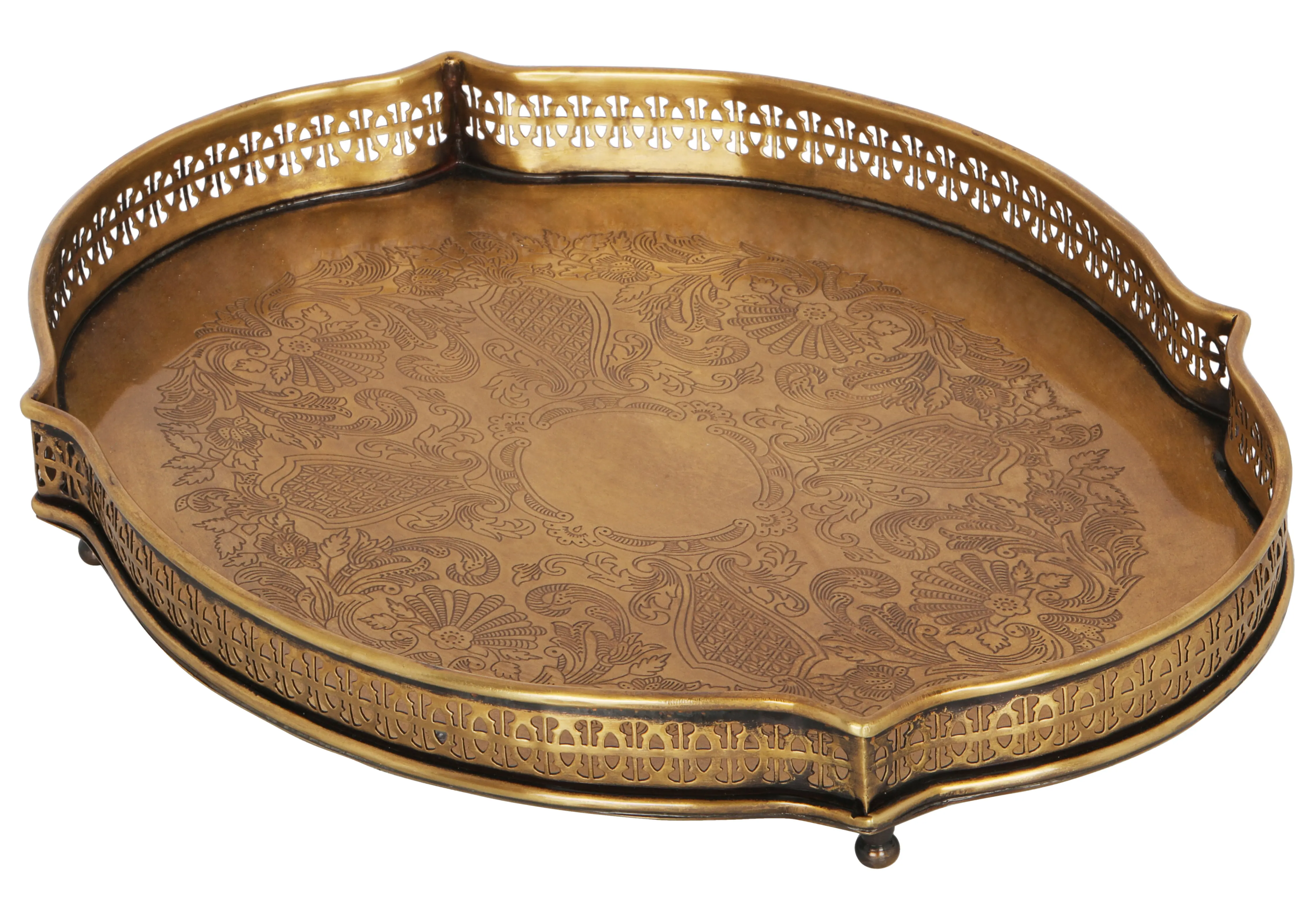 The beauty of this tray lies in its intricate craftsmanship. The floral carvings are meticulously detailed, showcasing the skill and artistry involved in its creation. Each curve and line is carefully crafted to create a harmonious and visually stunning design. The subtle variations in the brass finish add to its unique character, giving it a vintage-inspired look that is both charming and sophisticated. This tray is a testament to the enduring appeal of traditional craftsmanship and the beauty of handmade objects. It's a piece that will be admired and cherished for its artistry and timeless appeal.