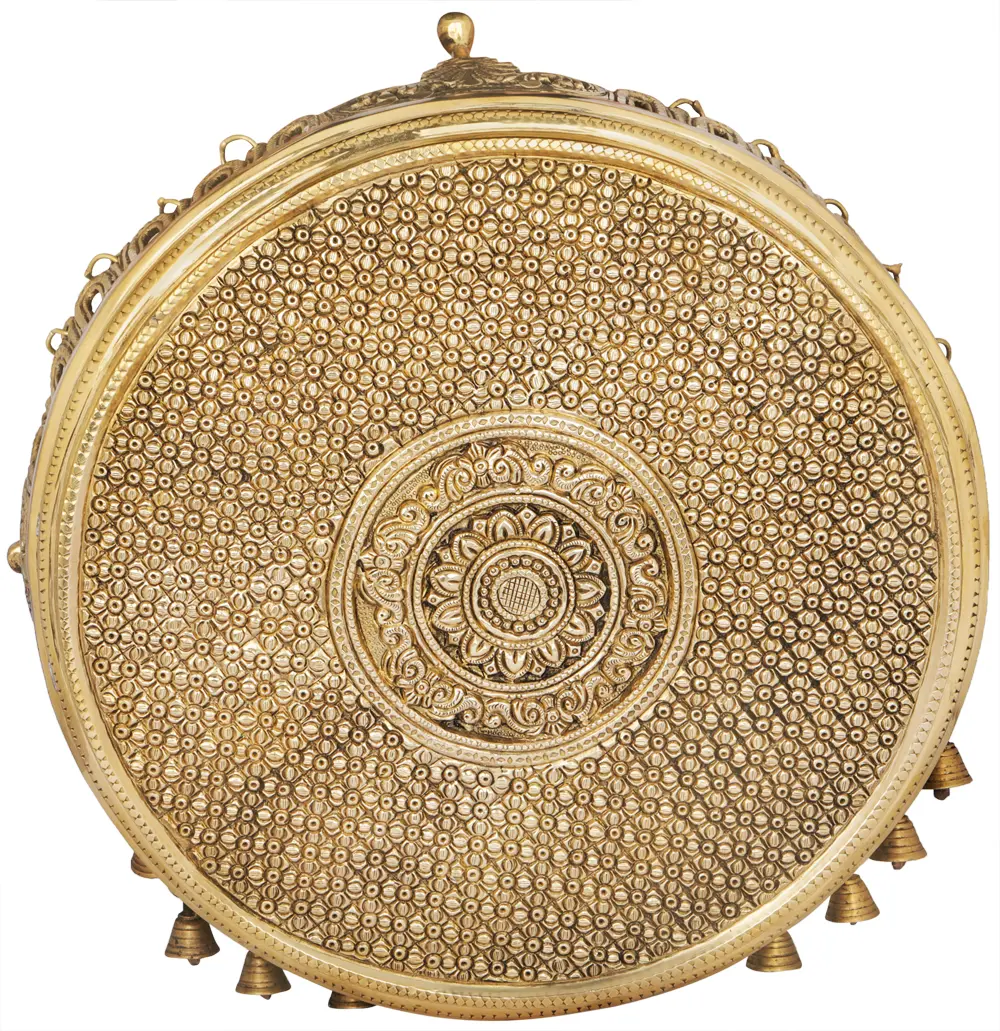 Elevate your spiritual space with the Flowers Engraved Circular Chowki (Pedestal) decorated with Bells, a harmonious blend of art and devotion. This circular chowki, adorned with intricate flower engravings, adds an element of grace and tradition to your spiritual rituals. What makes it even more special are the melodious bells, a harmonious touch that adds a gentle symphony to your sacred moments. It's more than just a platform, it's a work of art, a sacred stage for your rituals, and an embodiment of culture and reverence that enriches your spiritual practice.