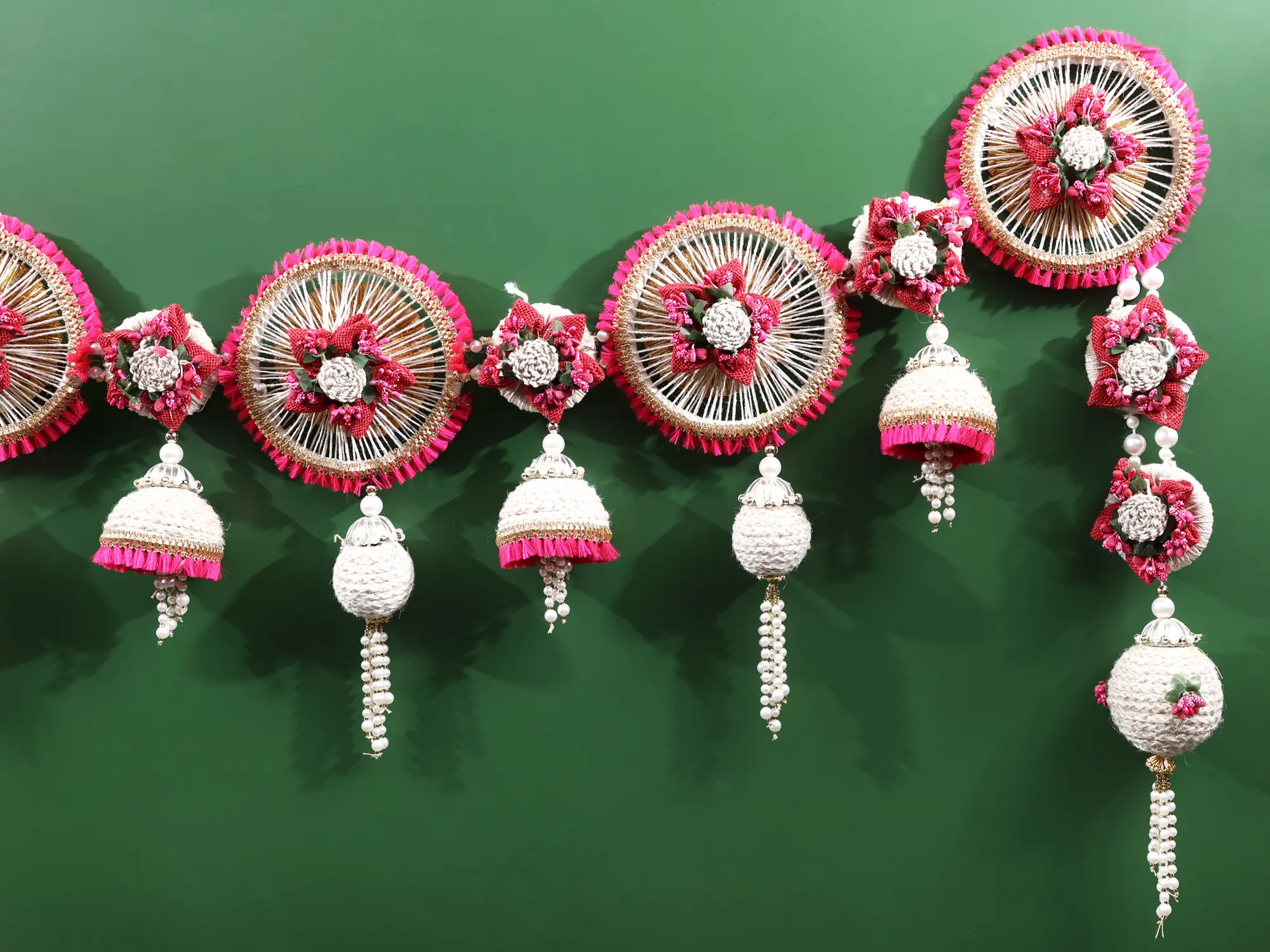 A harmonious fusion of tradition and charm, this auspicious toran, a door decor, will allow you to step into a realm of grandeur. The Toran, which originated in ancient Indian culture, is said to symbolize wealth, good luck, and welcome. Blooming with vibrant florals in mesmerising hues of fuschia and cream, this toran is the embodiment of cultural beauty. Adorned with beads and cascading tassels, each element whispers tales of opulence and grace.