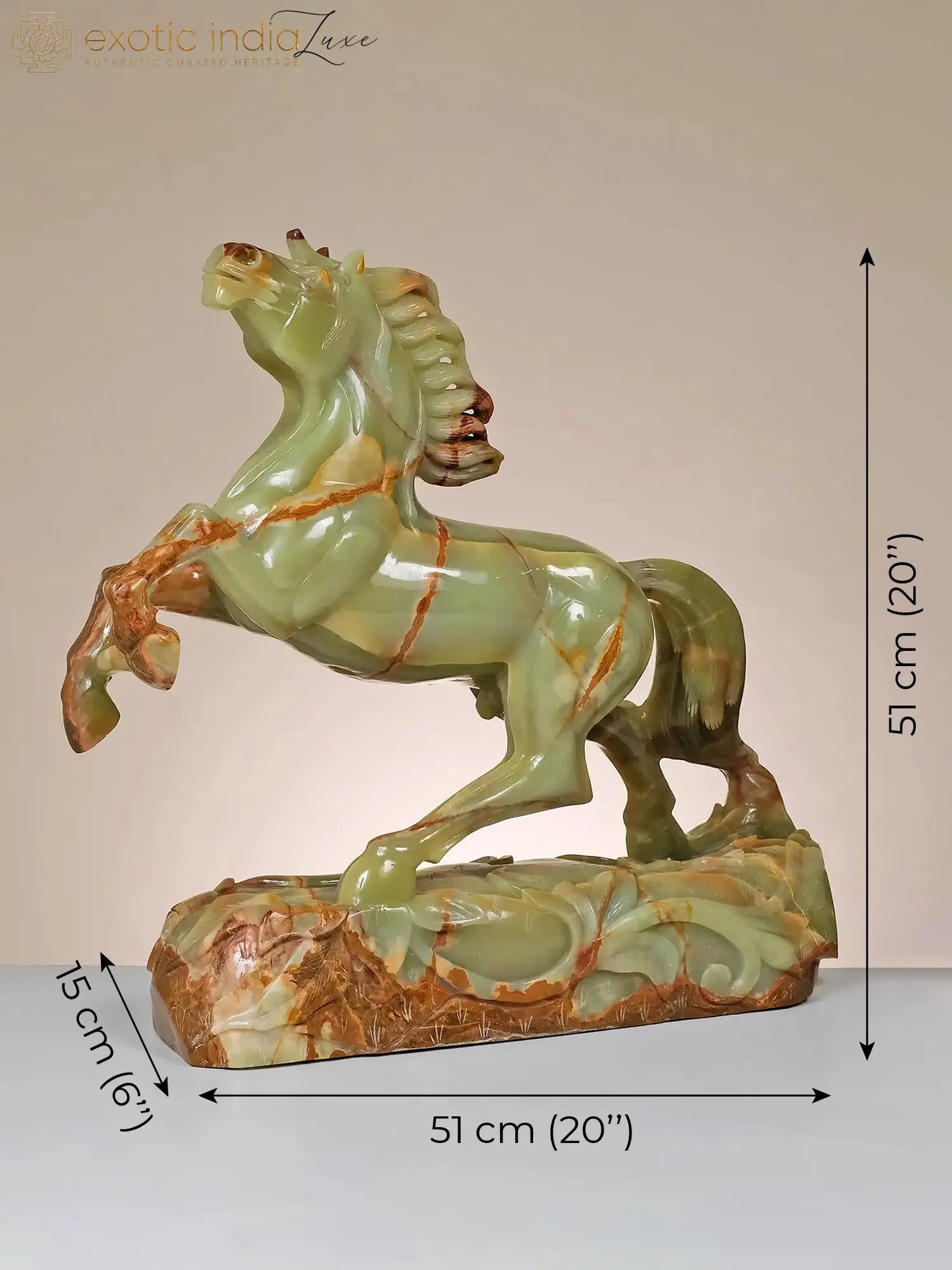 A stunning and dynamic work of art, The Galloping Horse in Onyx Gemstone portrays the grace and strength of a horse in full stride. This sculpture, made from a real onyx gemstone, is striking and eye-catching because it highlights the natural beauty and distinctive patterns of the stone.