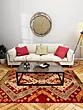 Made from pure wool, this dhurrie offers a luxurious feel underfoot while providing exceptional durability. The natural fibers create a soft and inviting texture, perfect for adding comfort to any space. The deep, garnet-red hue forms the foundation of the design, evoking a sense of warmth and sophistication. Contrasting colors accentuate the woven bootis, adding depth and visual interest to the overall pattern. The intricate geometric patterns and meticulously woven details create a timeless aesthetic that complements a range of interior styles, from traditional to contemporary.