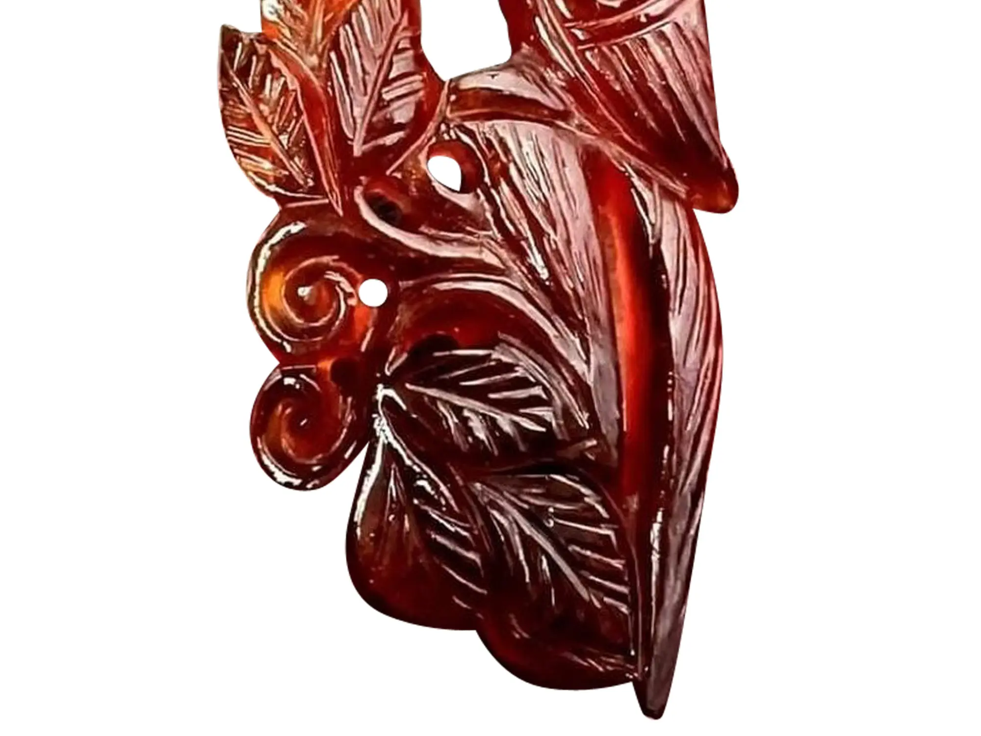Features detailed feather work and organic leaf motifs, highlighting the natural beauty of the gemstone.