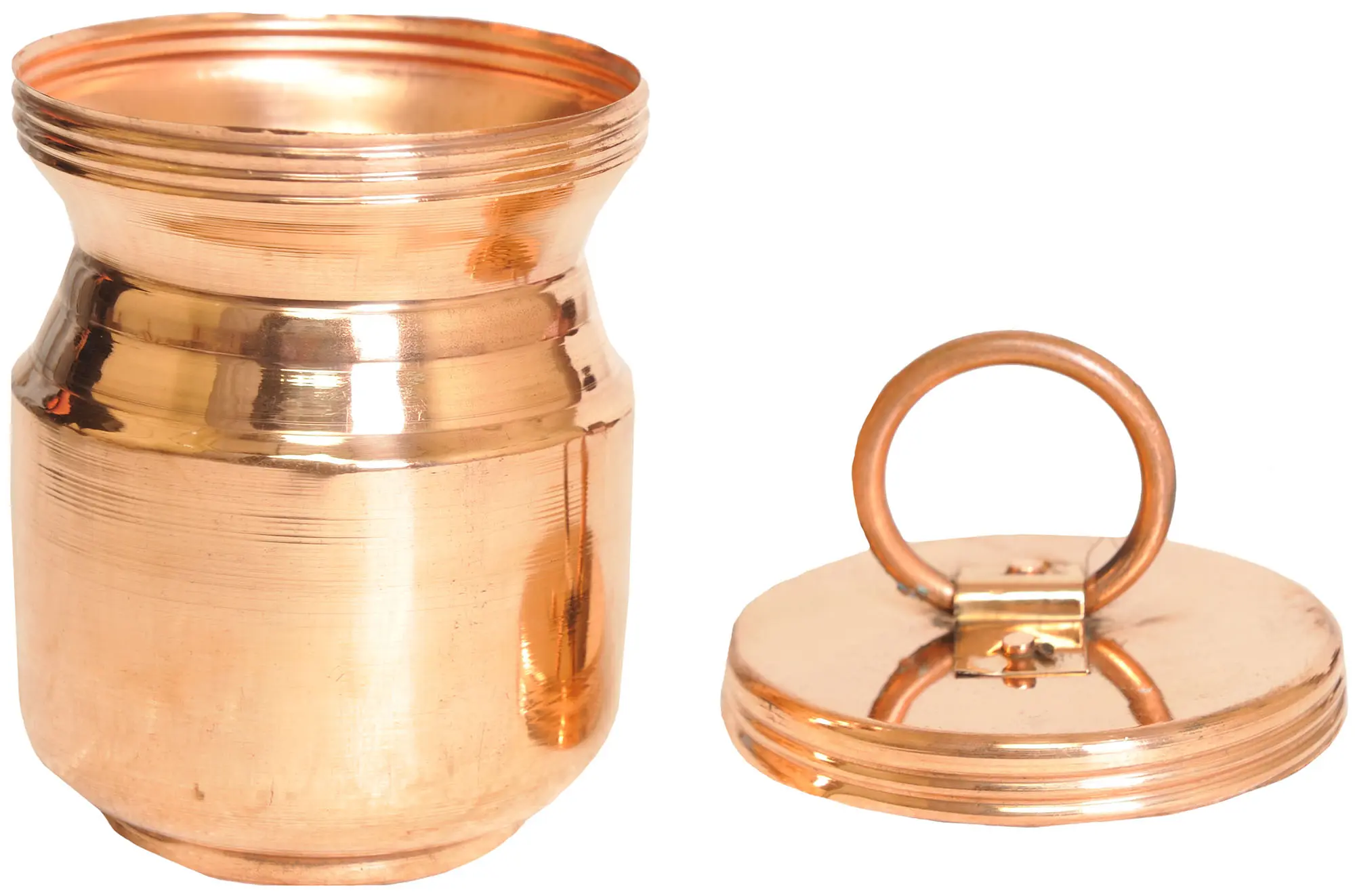 The beauty of this piece lies in its thoughtful design. The pot is fashioned from high-quality copper, known for its durability and natural antimicrobial properties. The sturdy build ensures lasting use, while the smooth, polished finish offers a luxurious feel. Notice the concentric rings around the lid, giving the object a classical feel and texture. The circular handle, firmly attached to the lid, adds a functional and aesthetic element. The handle's smooth form is comfortable to hold, offering a secure grip when moving or storing the pot.