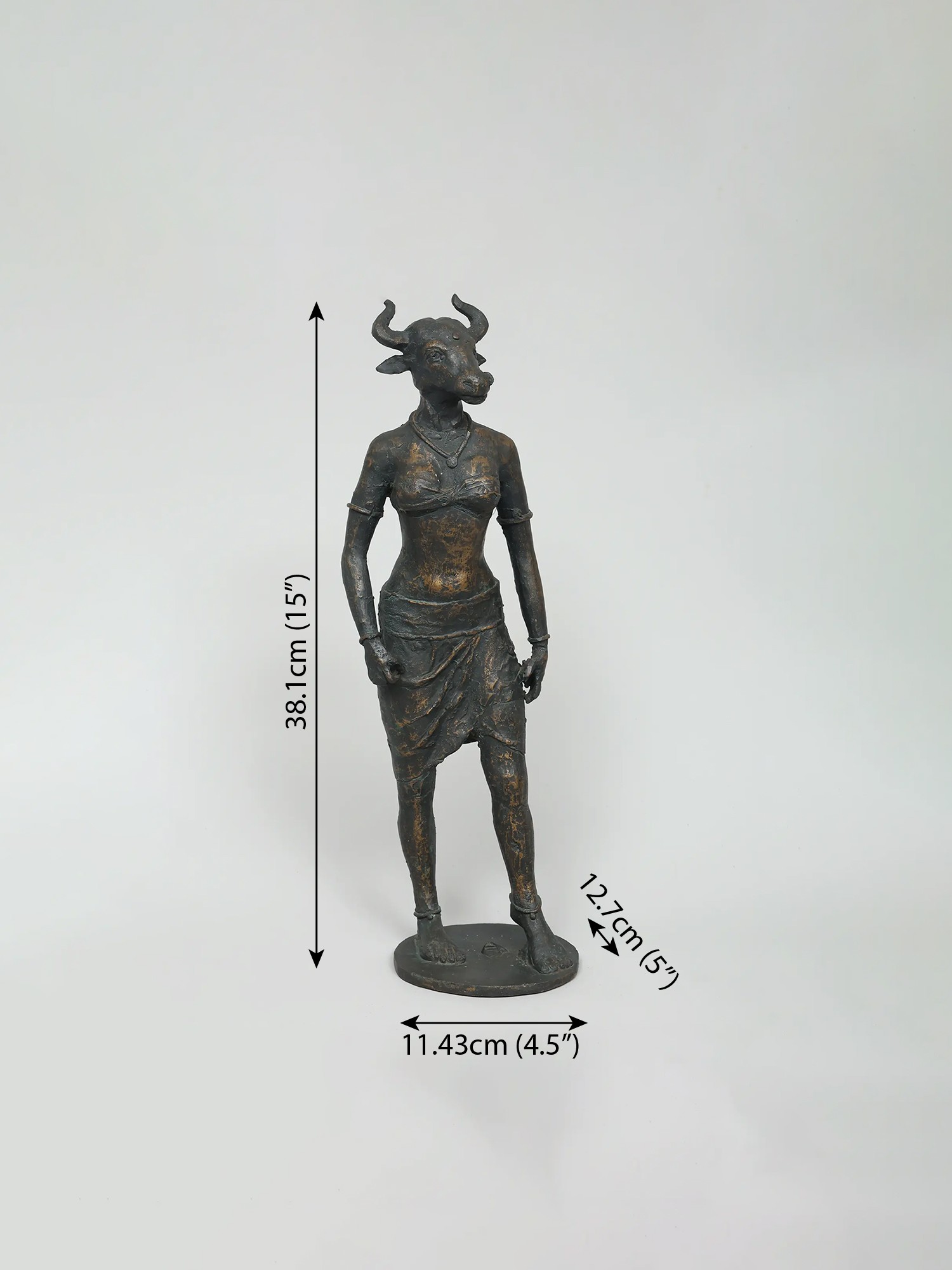 The sculpted texture of her form—the gentle curves, muscular calves, elongated fingers—conveys the physicality of a tribal or pastoral woman, while the bovine head, complete with horns, large ears, and expressive eyes, evokes the goddess-like presence of the cow in Indian cosmology.