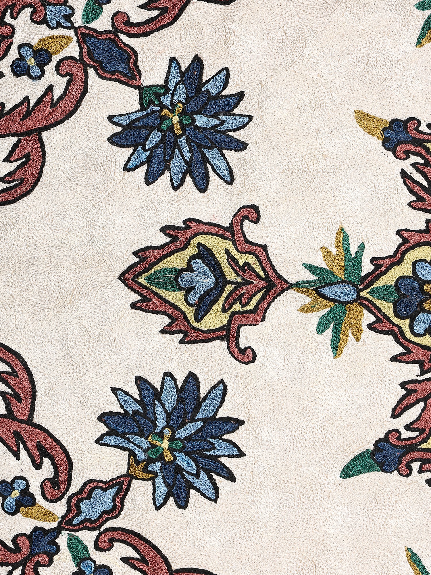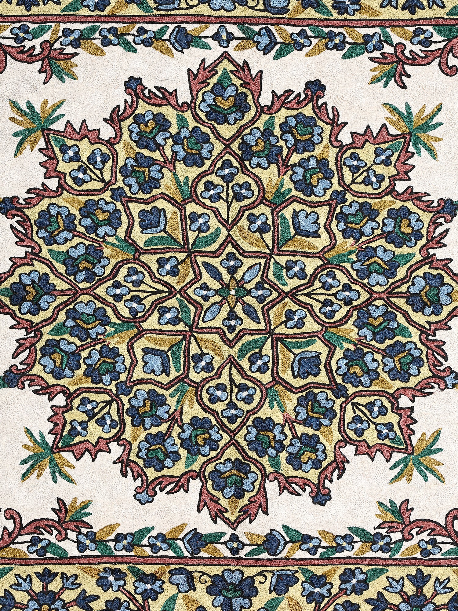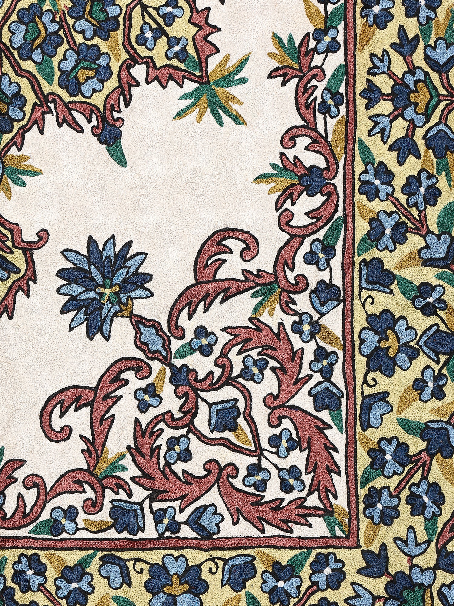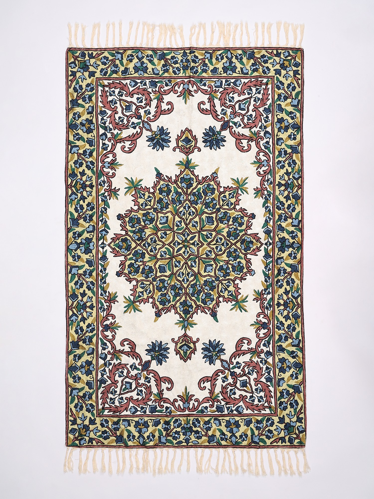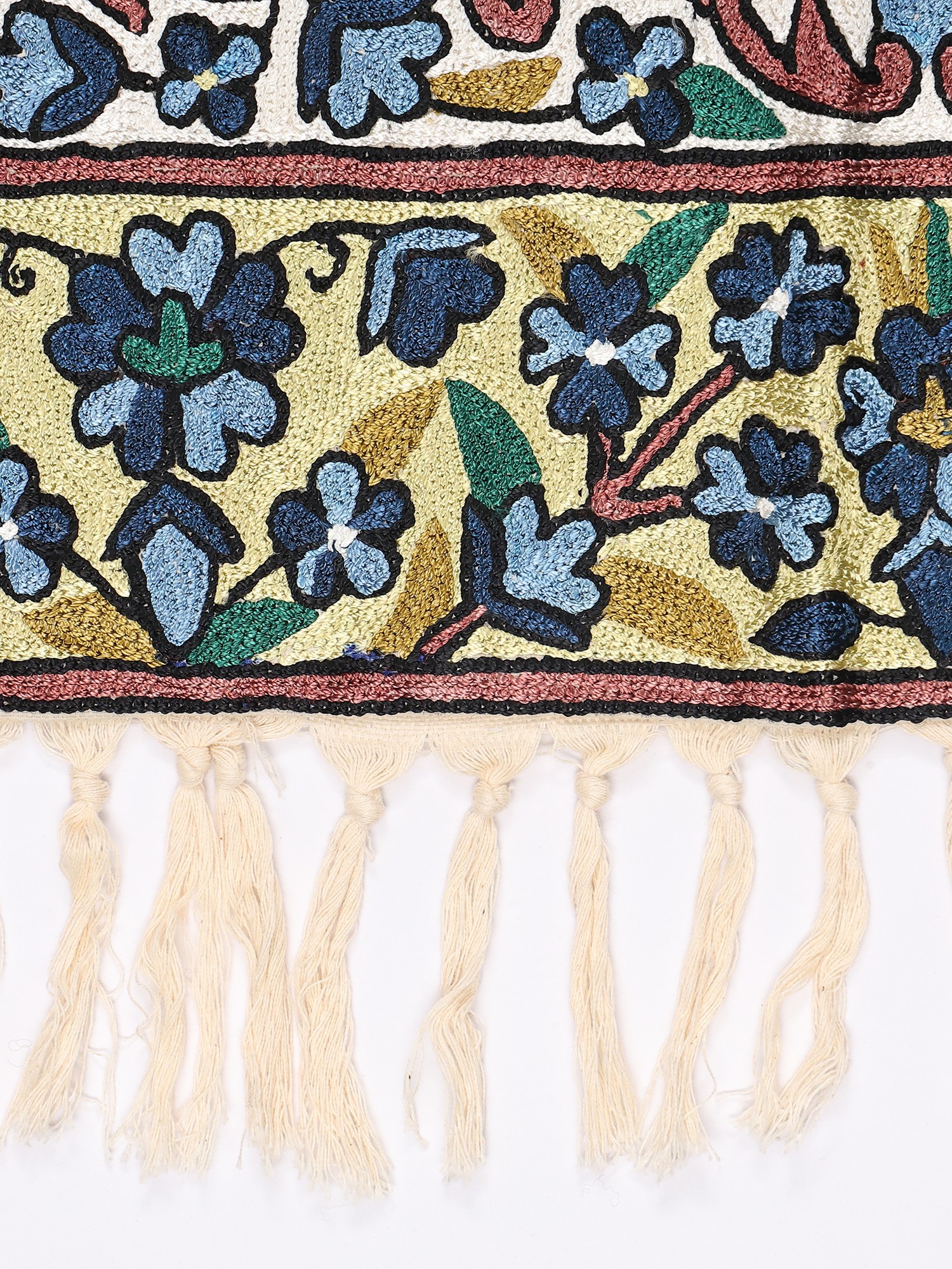 Off-White Chain Stitched Kashmiri Carpet with Floral Silk Threadwork