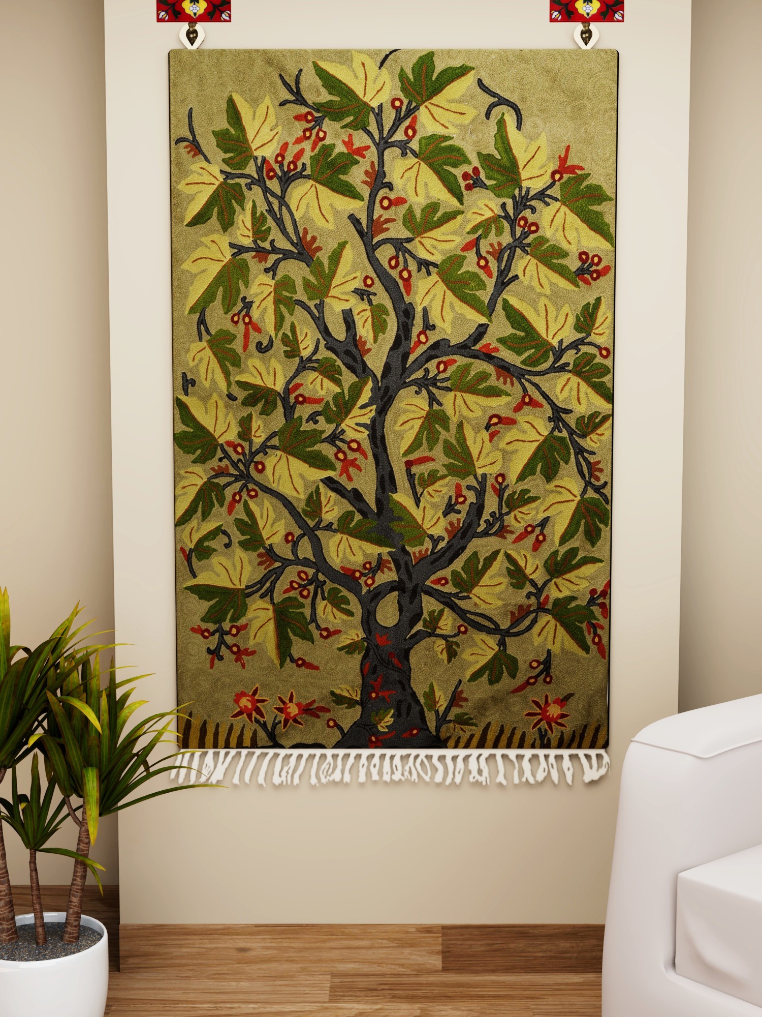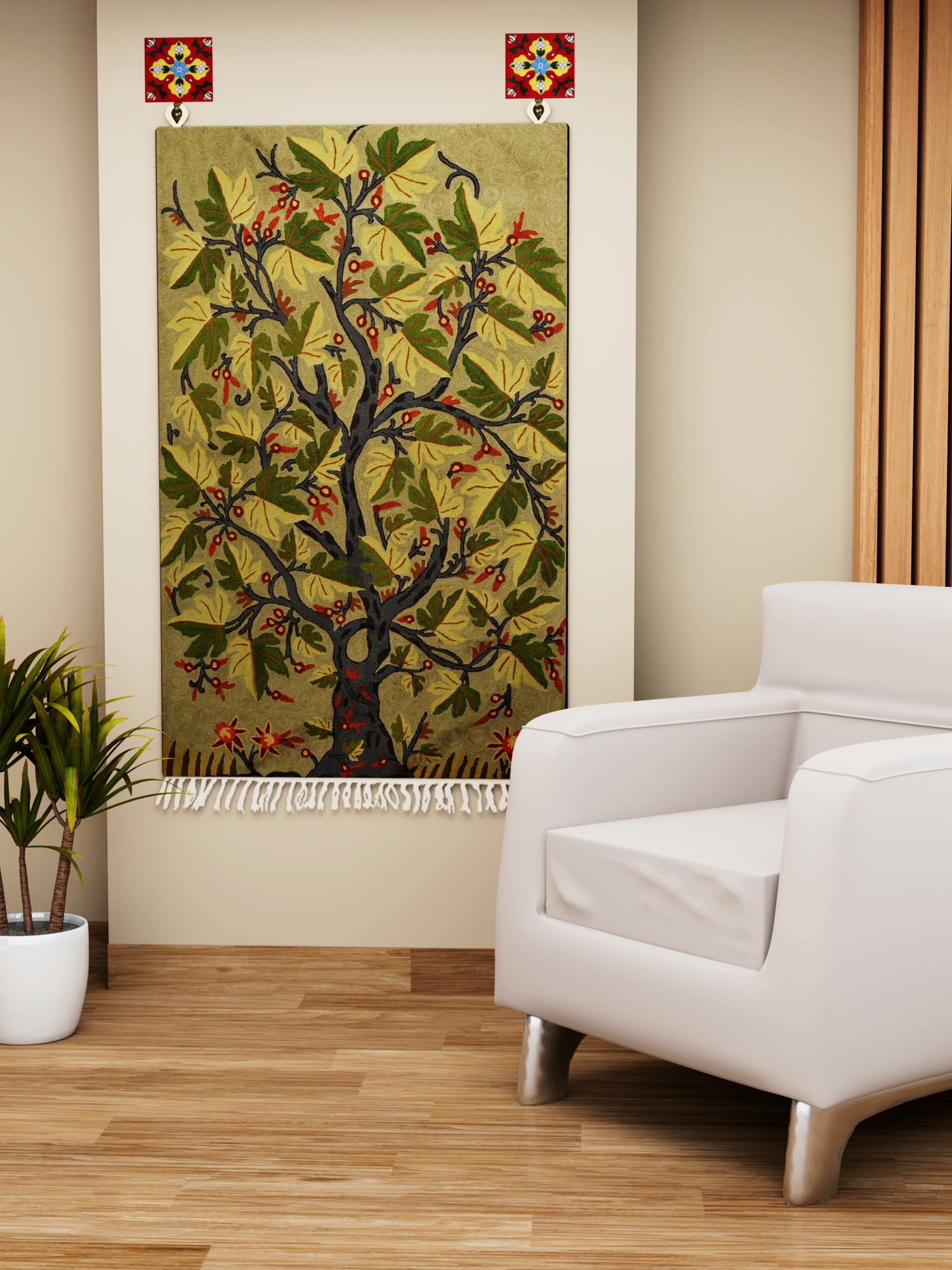 Enrich your living space with a touch of the serene beauty of Kashmir. This intricately crafted piece blends traditional artistry with a versatile design, offering both aesthetic appeal and functional value. More than just a decorative item, it is a testament to the skilled craftsmanship passed down through generations. Imagine the cool mountain air and the vibrant hues of autumn leaves as you gaze upon the embroidered maple tree. Each stitch tells a story, a tale of dedication and passion that has been poured into creating this unique artwork. The muted green canvas provides a calming backdrop for the intricate embroidery, allowing the colors of the maple tree to truly shine. The leaves, rendered in shades of green and gold, evoke the tranquility of a forest glade, while the touches of red add a spark of warmth and vitality.