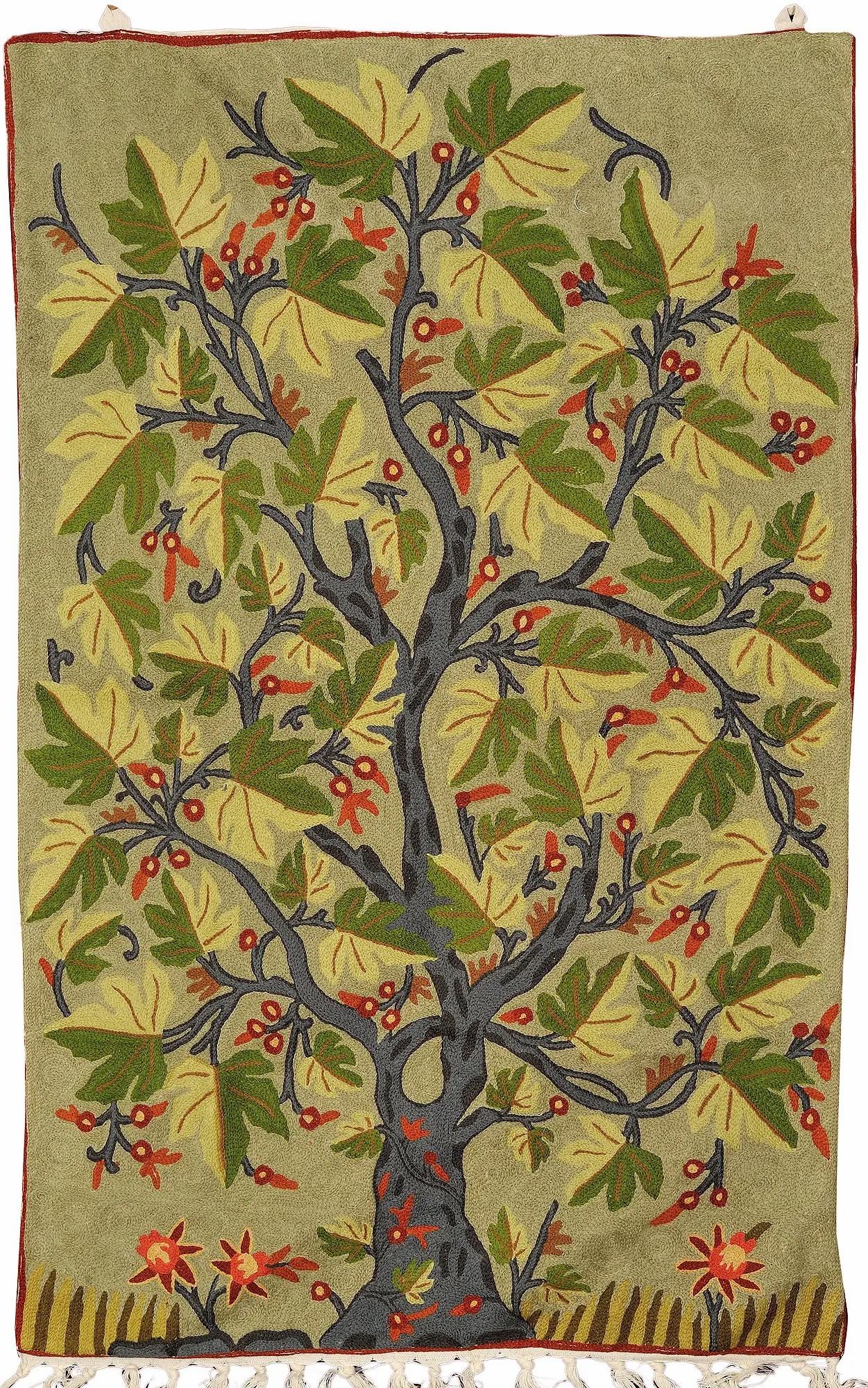 Made with high-quality wool on canvas, this piece is not only beautiful but also durable and long-lasting. The natural fibers offer a soft and luxurious feel, while the sturdy canvas provides a strong foundation for the intricate embroidery. The attention to detail is evident in every stitch, from the delicate rendering of the maple leaves to the carefully chosen color palette. Measuring 48 inches in length and 30 inches in width, this piece is perfectly sized for a variety of uses and spaces. Whether you choose to use it as an Asana or a wall hanging, it will bring a touch of Kashmiri artistry and culture into your home.