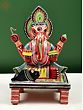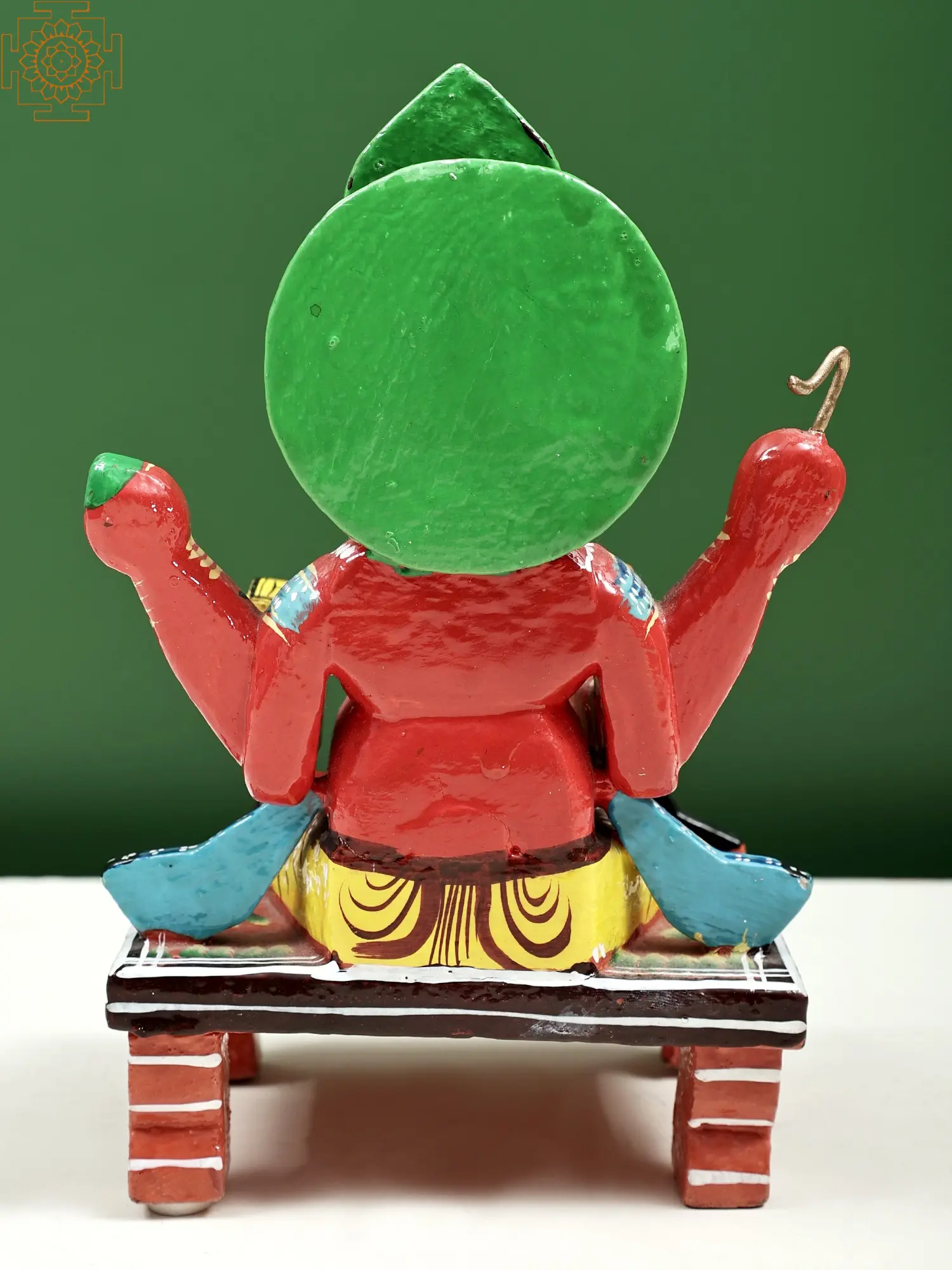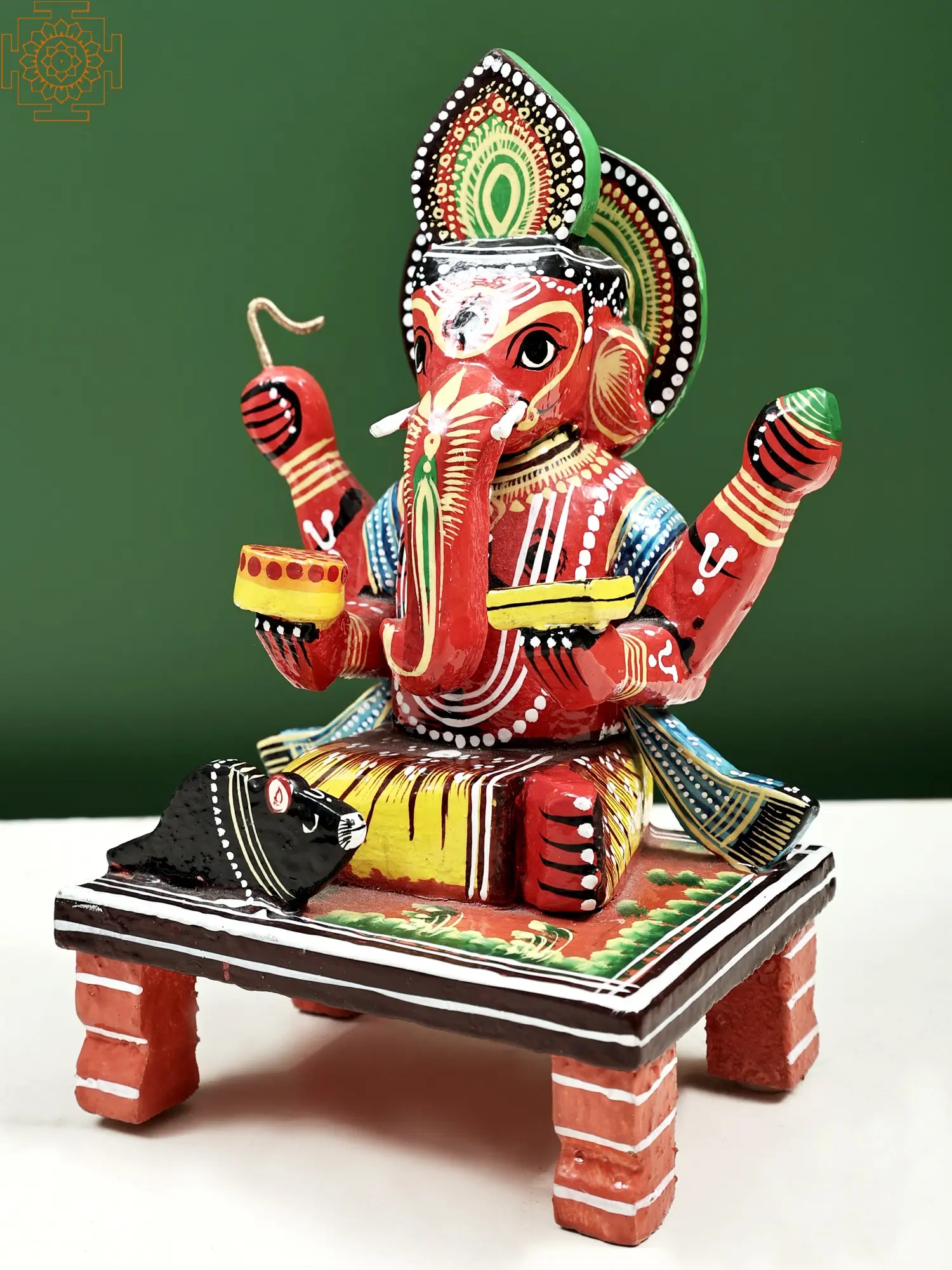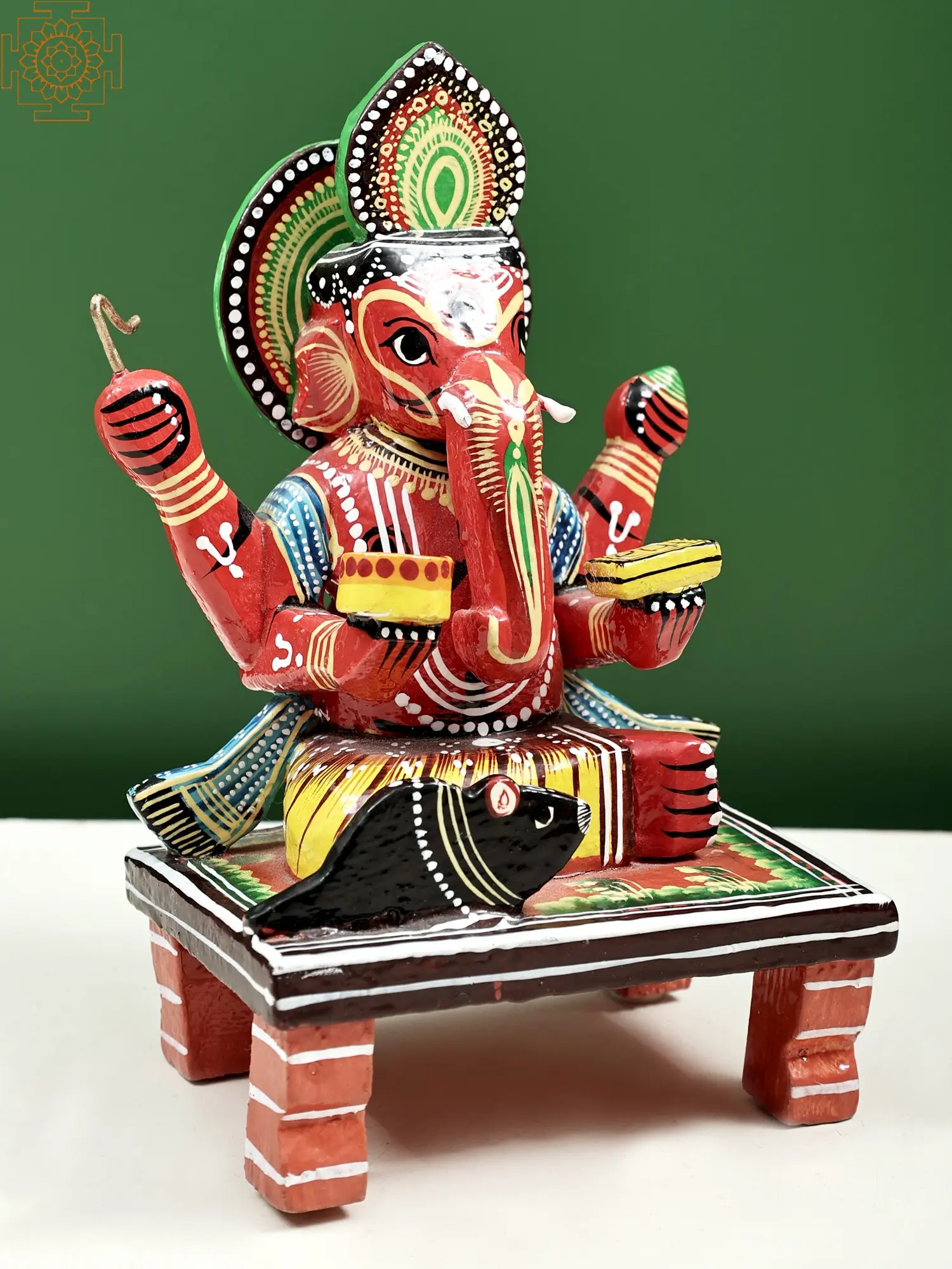 Carved from durable wood, this Ganesha doll is not just a decorative piece but a work of art. The intricate hand-painting showcases a symphony of colors, from the deep reds and vibrant yellows to the calming blues and verdant greens. Every detail, from the expressive eyes and the trunk that elegantly curls to the symbolic offerings held in his hands, has been rendered with remarkable precision. The decorative motifs adorning his headdress and body are characteristic of traditional Indian folk art, adding layers of cultural richness to this divine representation. The base on which Ganesha is seated is equally adorned, depicting a miniature yet detailed tableau, further enhancing its artistic appeal.