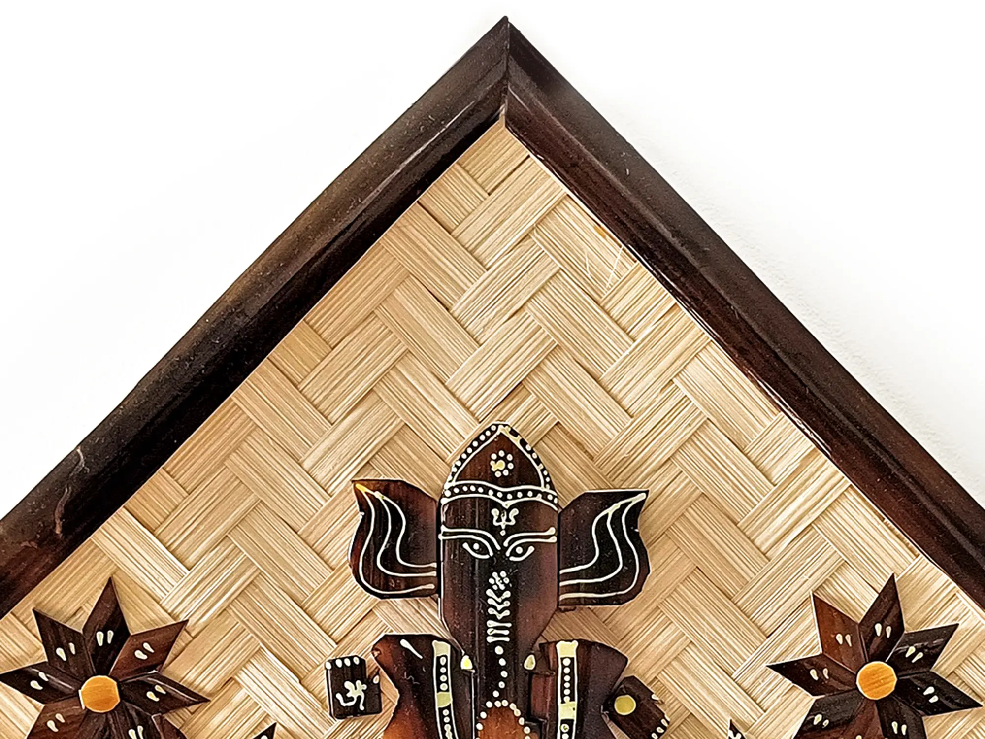 The beauty of this Ganesha wall hanging lies in its authentic craftsmanship. Each piece is carefully handcrafted using traditional techniques, ensuring both quality and uniqueness. The natural bamboo provides a textured and organic feel, while the dark brown frame adds a touch of sophistication. The delicate inlay work on Ganesha and the surrounding floral designs elevates this piece to a true work of art. Its distinct design seamlessly blends traditional aesthetics with a contemporary style, making it suitable for various interior design schemes. It is the ideal choice for those seeking a unique and spiritually meaningful addition to their home.