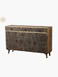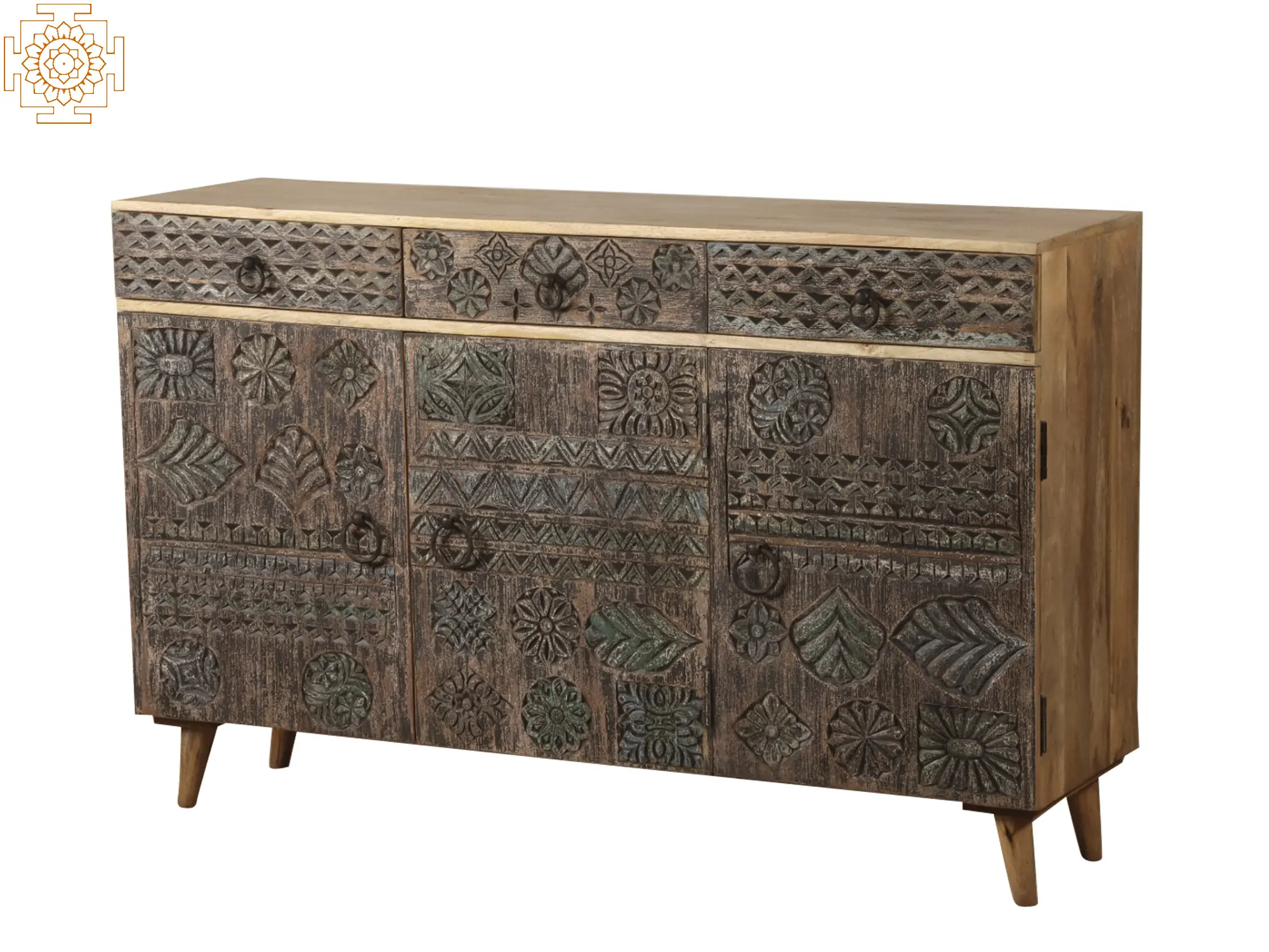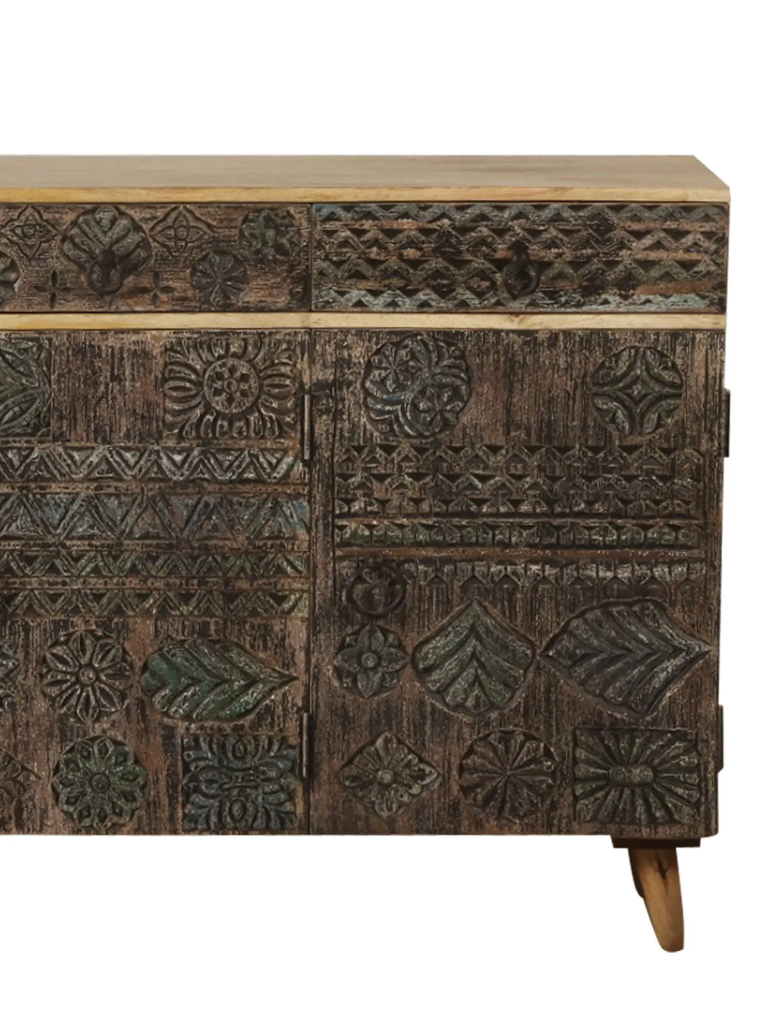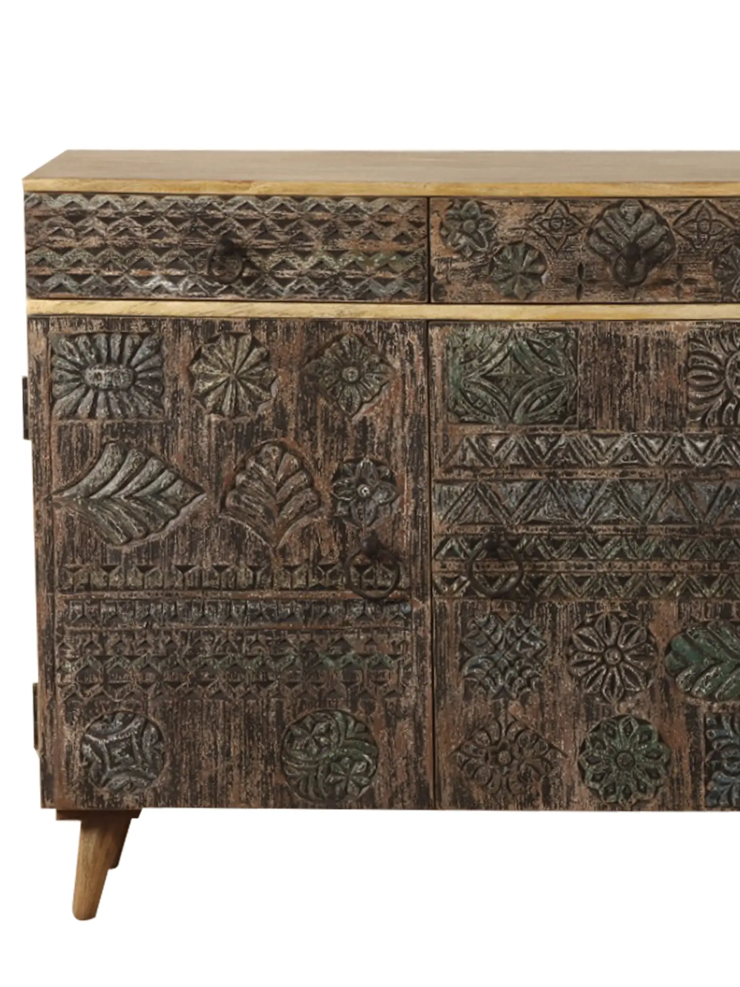 Furniture in India has developed over time, incorporating numerous components to suit modern house décor. This carved antique cabinet made of good quality mango wood retains the classic carving technique while also serving as a pleasant complement to modern home décor. This cabinet is given a rustic appearance by being decorated with wooden blocks with carved flora and fauna. The drawers and cabinets come with handles for utility. This is a lovely piece of furniture for enhancing the design of the living space.
