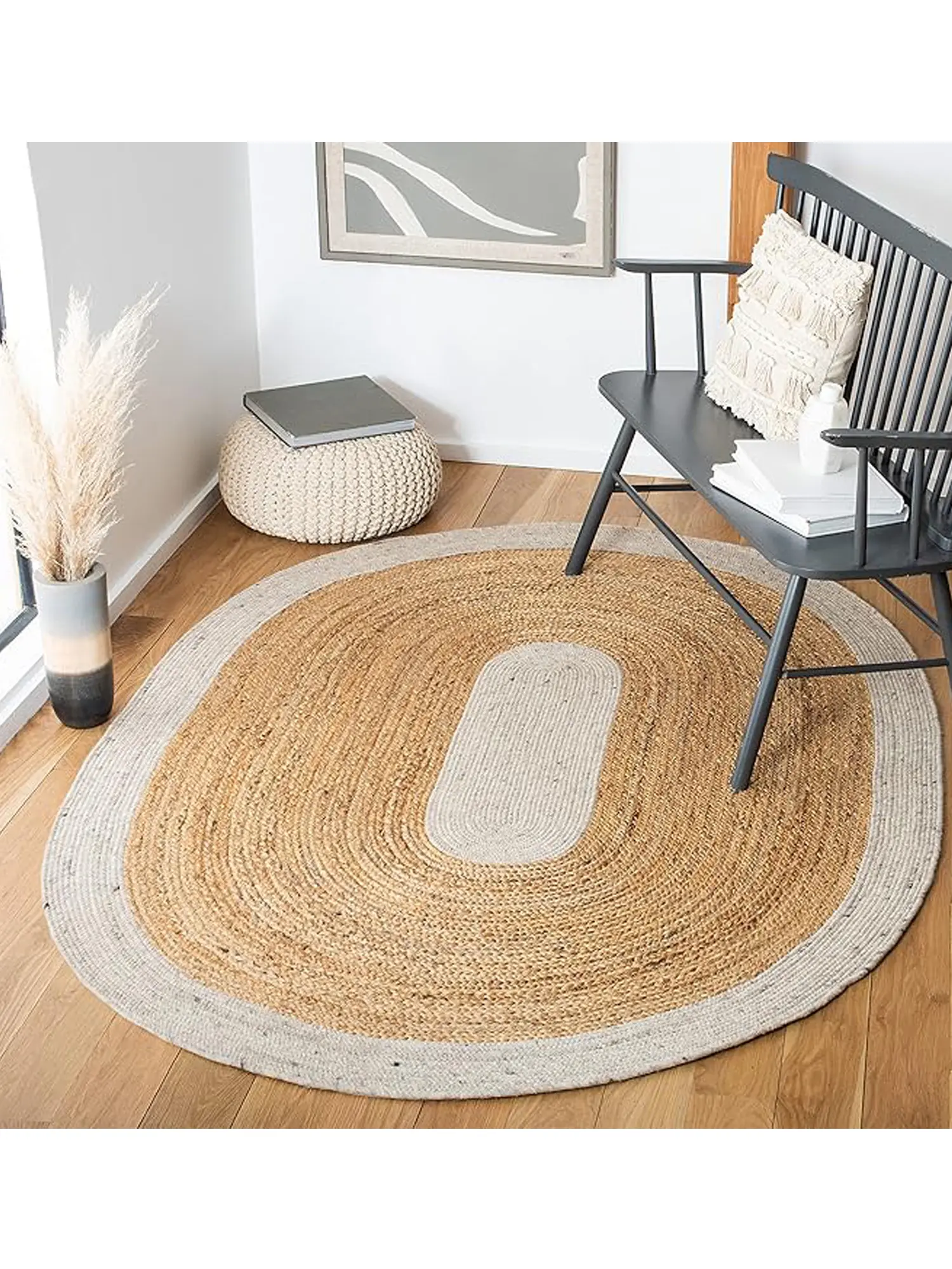 Scalloped Natural Jute Area Rug, Natural Base Off White Trim