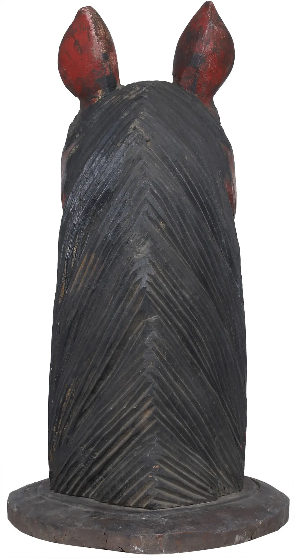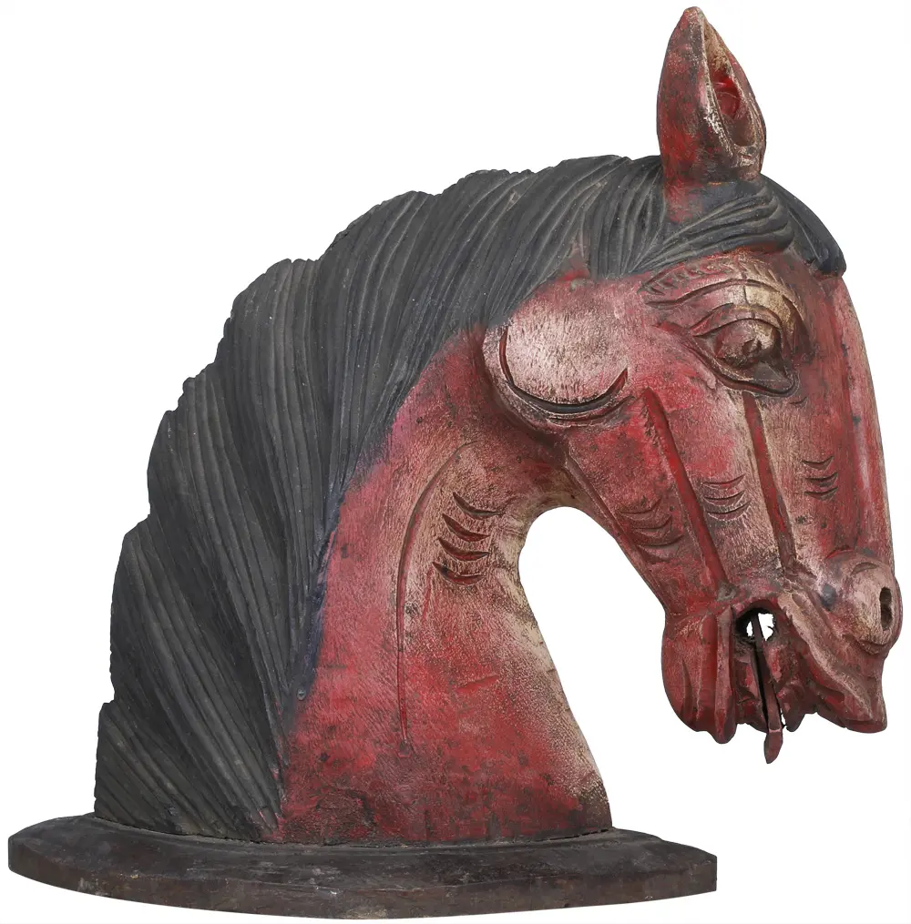 This magnificent wood carving bust of Horse Head mounted on a round/ spherical base has been created out of a single large wooden block using hammer and chisel, the artisan carved out and shaped the figure layer by layer featuring detailed carving. high-grade buffing was used to get its natural shine before giving the final effects of paint & polish. Its charming face curving with a lengthy & solid neck waving the beautiful shining long hairs, a pair each of attractive eyes and standing ears, the nose, and the smiling jaws The result is a fine sculpture with great details and high quality.
