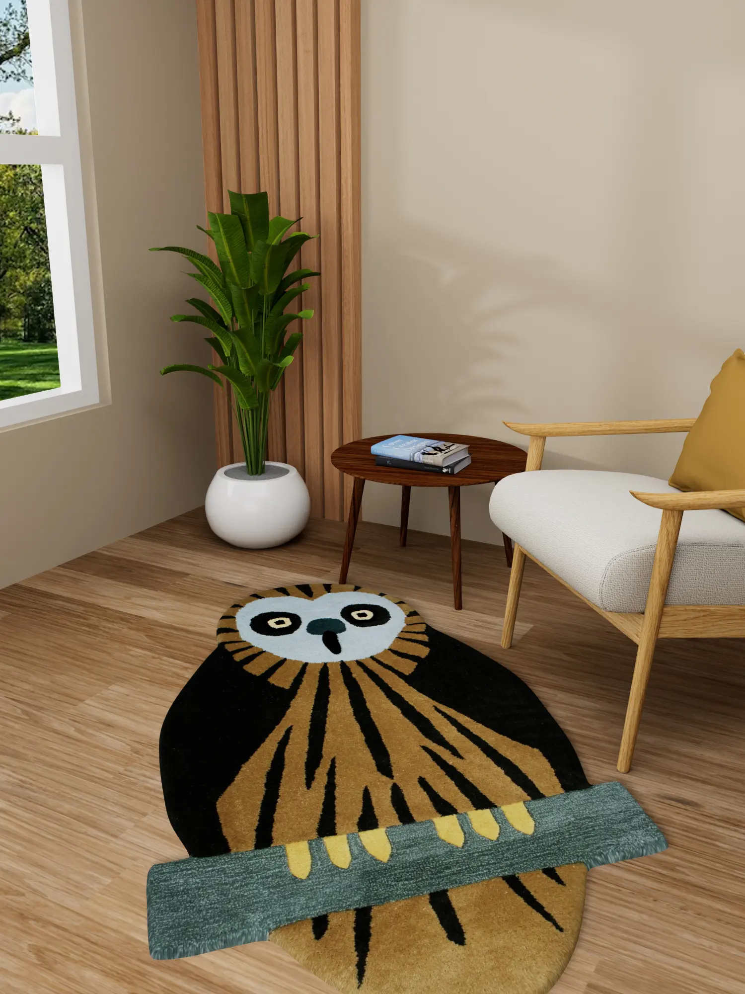 Bring a touch of whimsical charm and natural wonder into your home with this uniquely designed wool mat. Crafted with a playful yet sophisticated aesthetic, this piece features a captivating owl perched serenely on a branch. The owl's endearing expression, with wide, curious eyes and an open beak, is rendered in soft, inviting colors, creating a character that is both heartwarming and visually striking. The intricate details of its plumage are brought to life through the rich textures and precise craftsmanship, showcasing the natural beauty of wool. The artful depiction of the owl is balanced by the grounding element of the branch, rendered in a complementary cool grey. The combination of earthy browns, deep blacks, and subtle grey creates a harmonious palette that can effortlessly blend with various interior design styles, from modern eclectic to cozy bohemian. This mat is more than just a decorative item; it's a conversation starter and a piece that imbues your space with personality and a sense of playful sophistication.