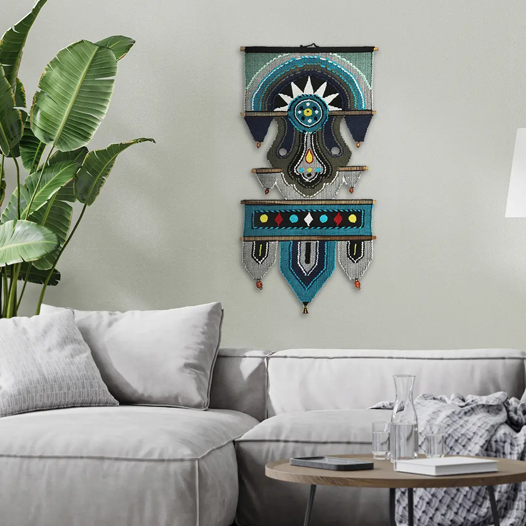The cool colors used in this wall hanging, such as shades of blue and white, create a soothing and refreshing ambiance, perfect for creating a tranquil atmosphere in any space. The intricate craftsmanship and use of wooden beads and brass bells add texture and depth to the piece, enhancing its visual appeal.