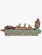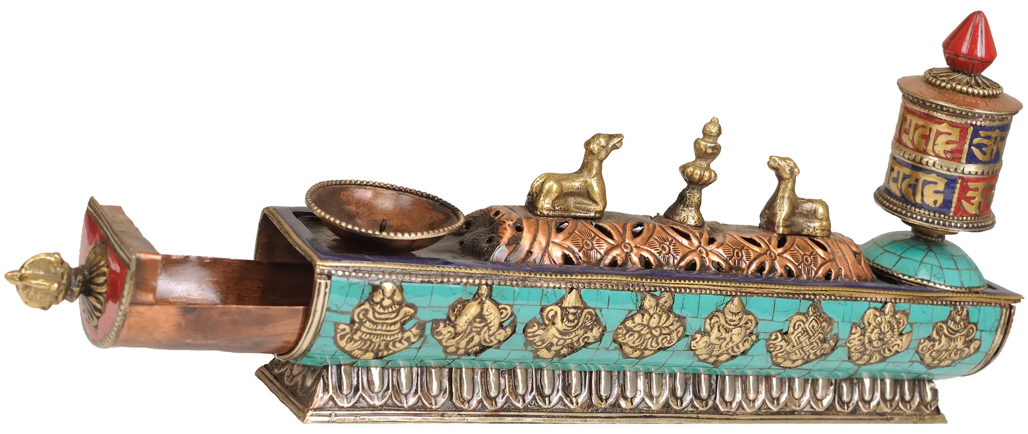 Examine the craftsmanship embedded in every aspect of this piece. The body features an inlay of what appears to be turquoise and gold. The piece is decorated with small decorative elements, including a prayer wheel, a candle stand and two decorative animal figurines. This decorative element adds a dynamic quality to the overall aesthetic. The prayer wheel features ornate carvings in blues, reds and golds. The handle of the prayer wheel can be rotated. The piece appears to be supported by a series of arches to provide stability.