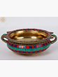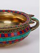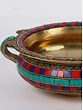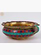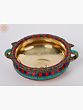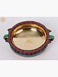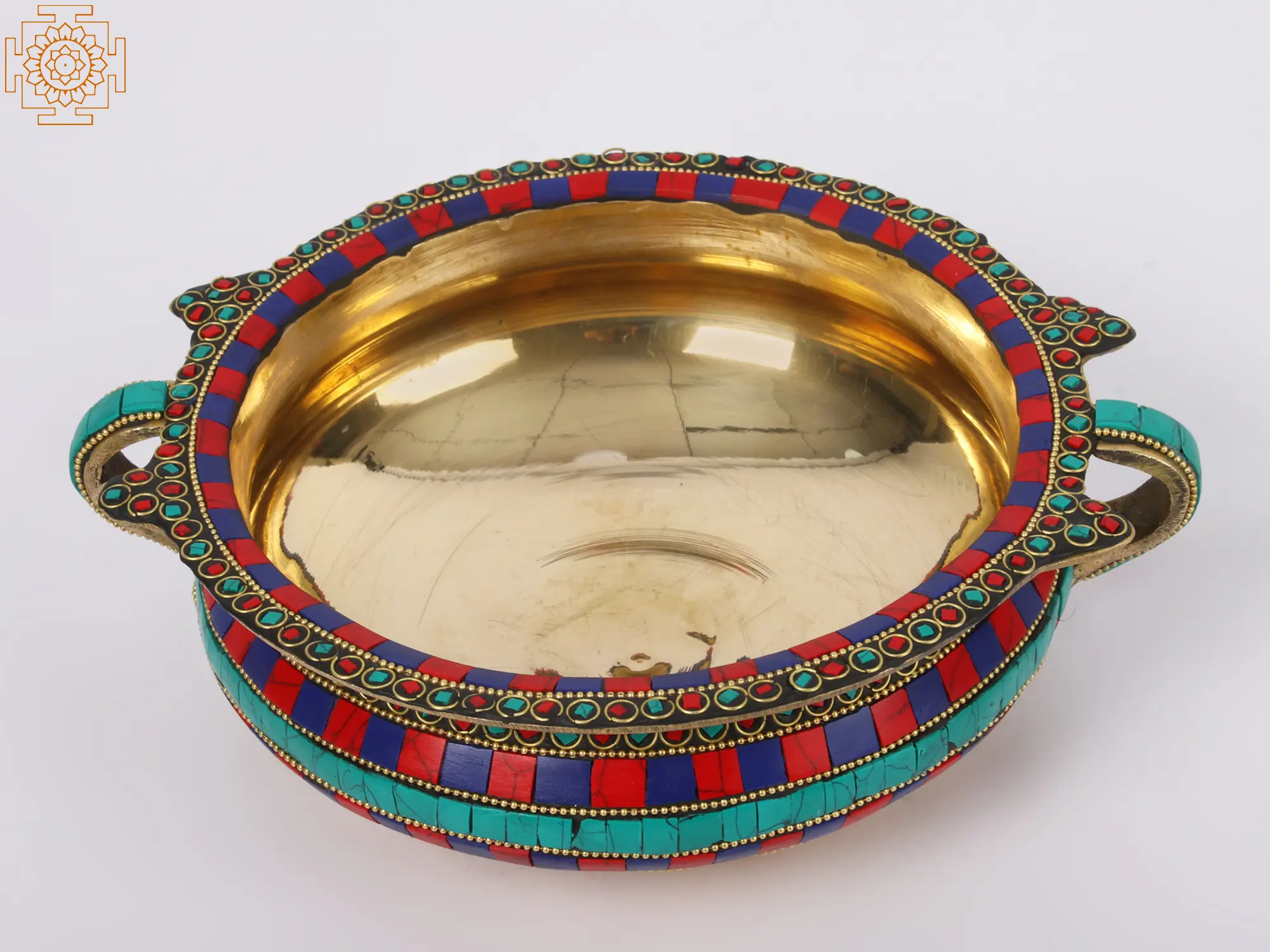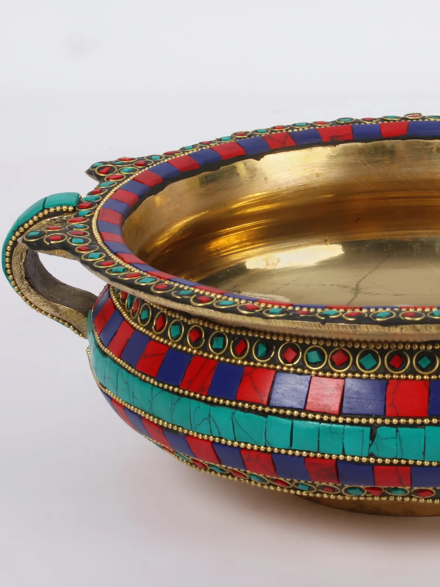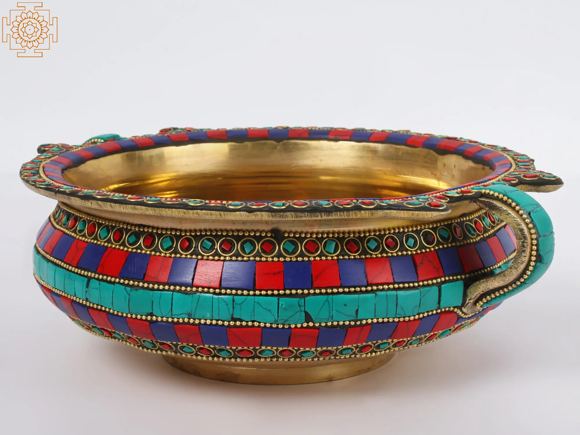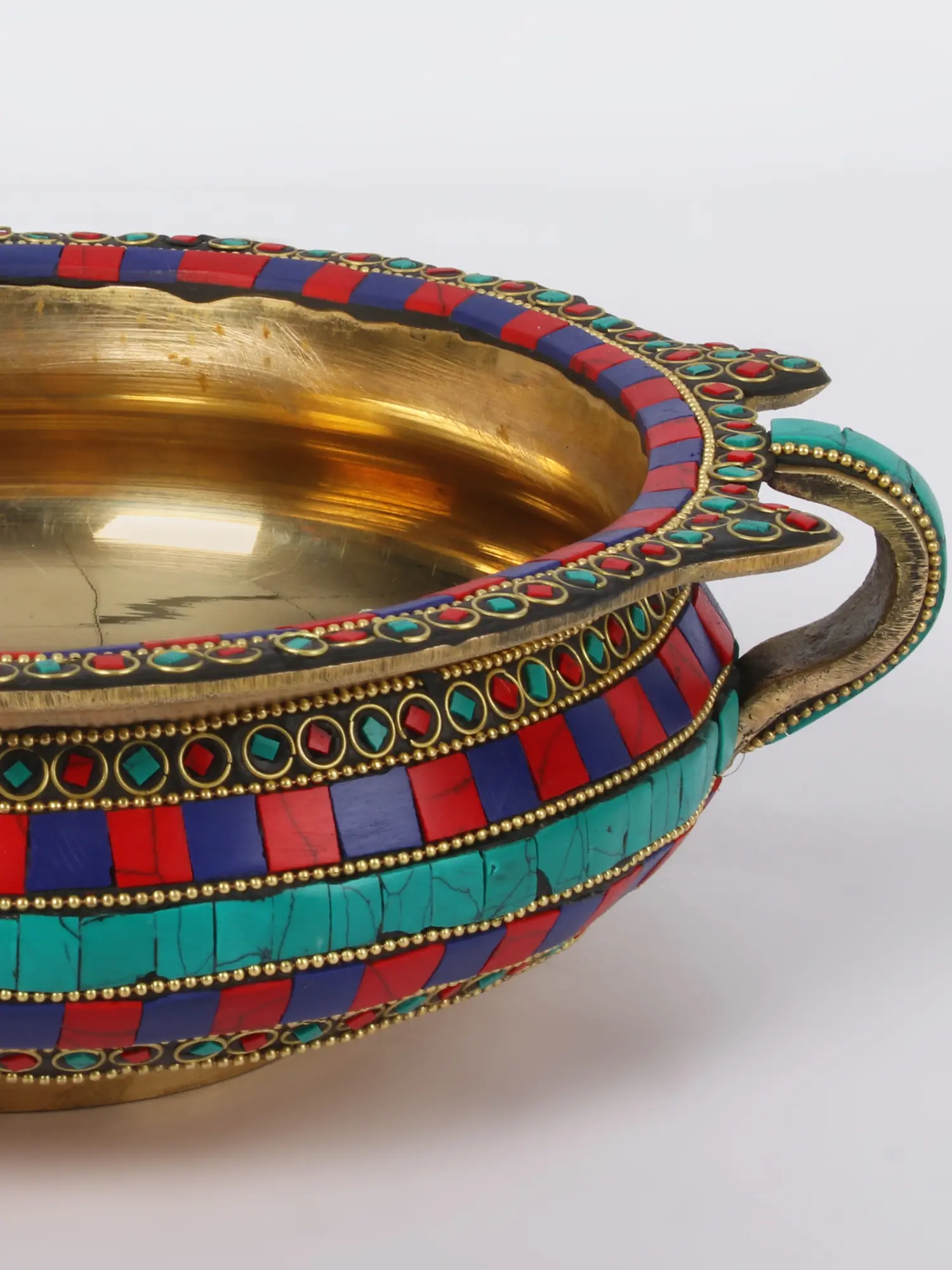 There is something about these Urlis that changes the entire decor of the room in which it is kept. Their traditional yet elegant appearance lights up the mood of the house. The Urli that you see here is adorned with amazing symmetrical inlay work of rich colors all over the body of the bowl. Even the handles supporting the bowl are decorated with turquoise inlay and the rim features circular and rectangular patterns that look extremely attractive. This Urli is perfect for festive decorations in which you can fill it with water and float some fresh flowers and light some diyas or candles around it on the floor.