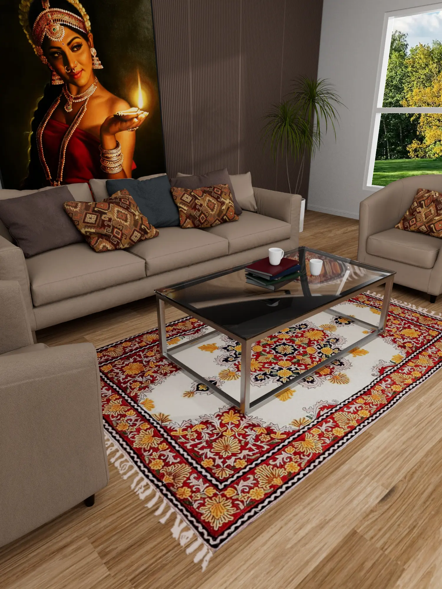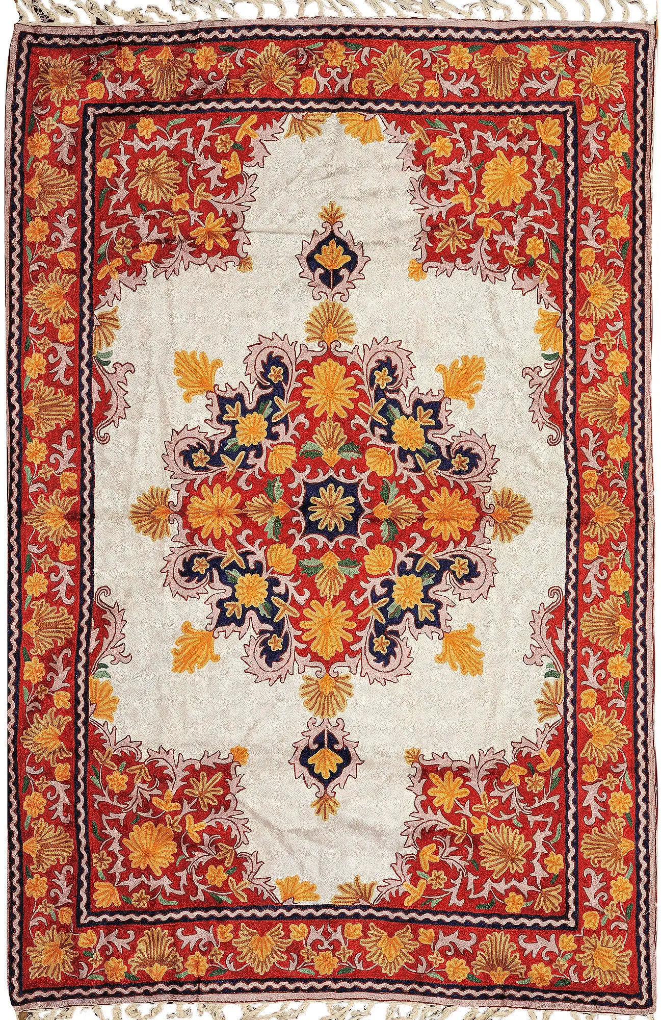 Cream and Pink Kashmiri Asana Mat with Embroidered Floral Motifs