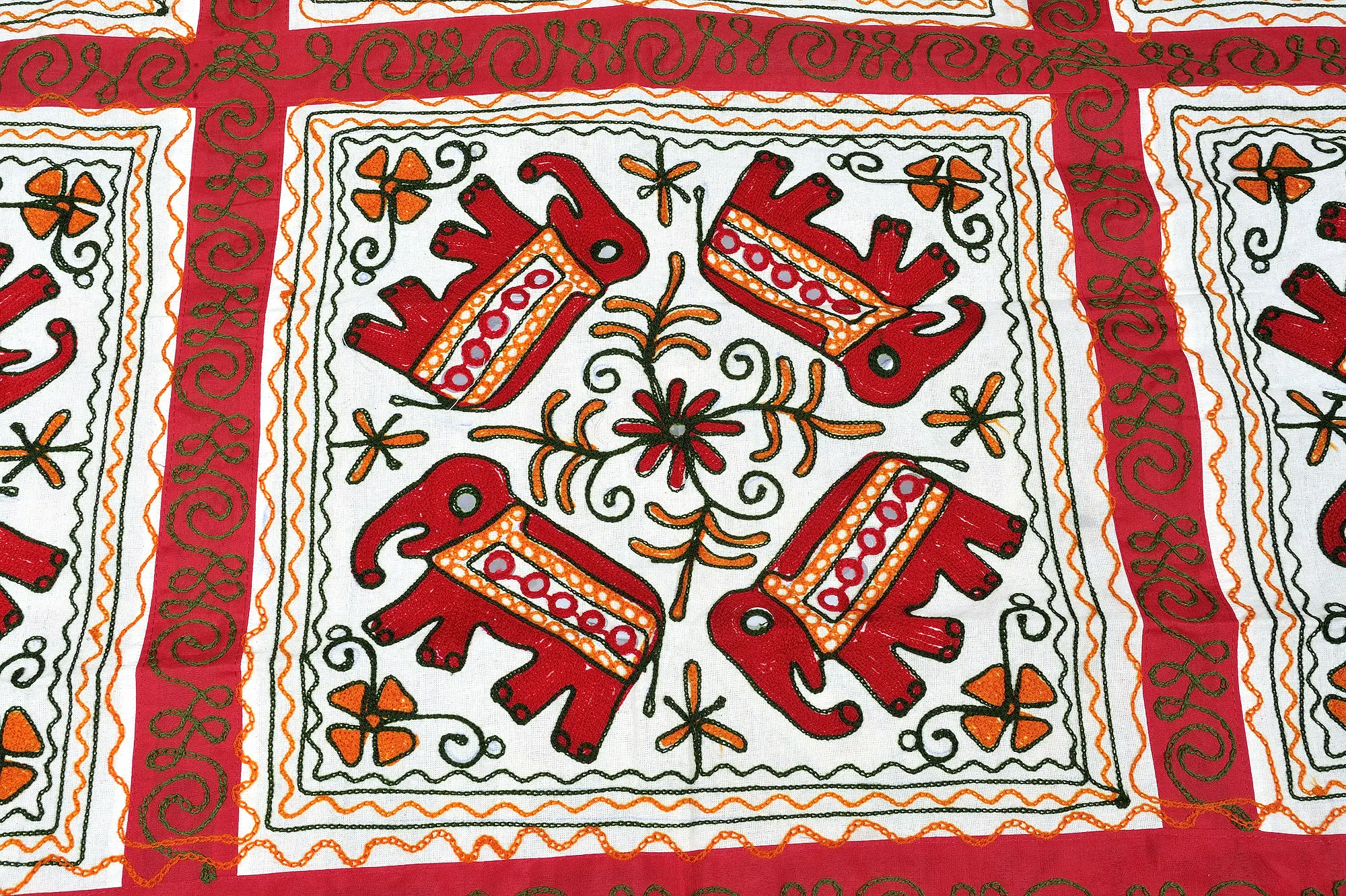 Ivory and Red Gujarati Bedspread with Embroidered Elephants and Mirrors