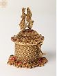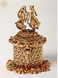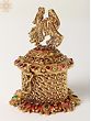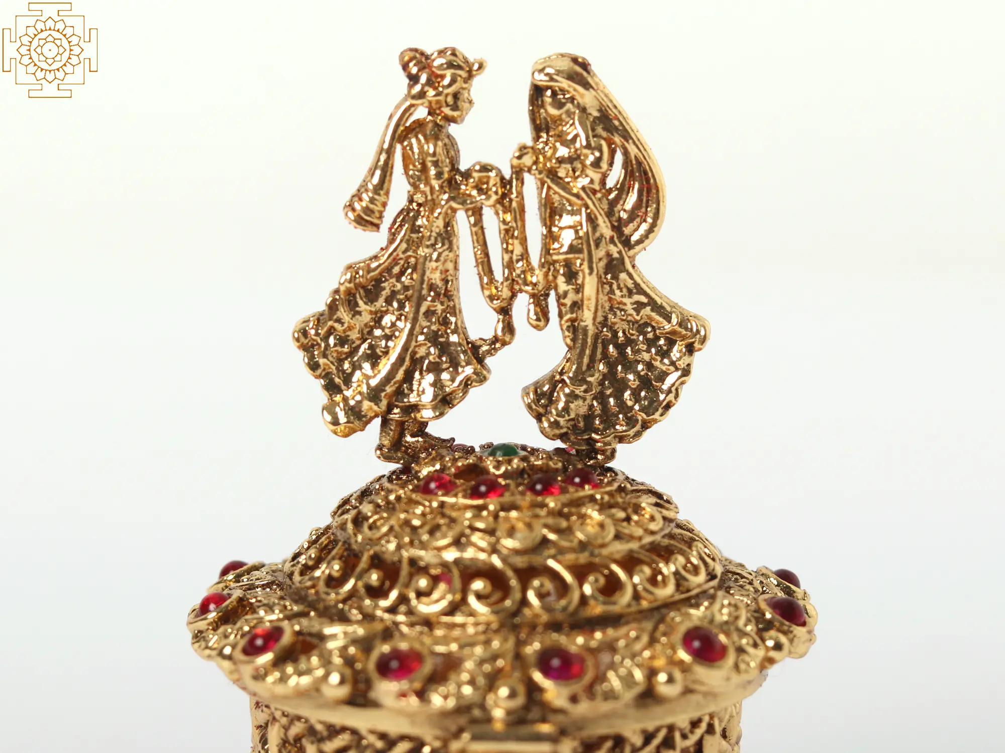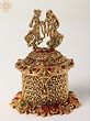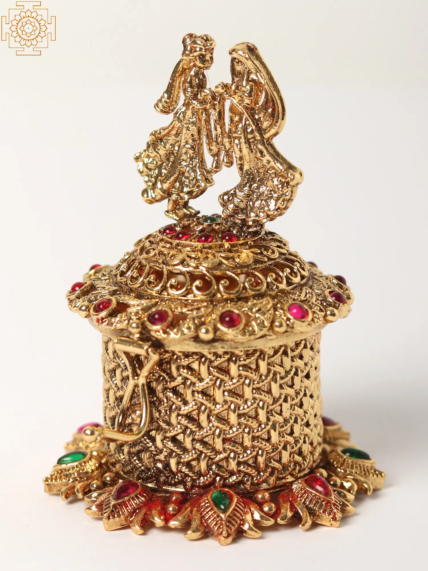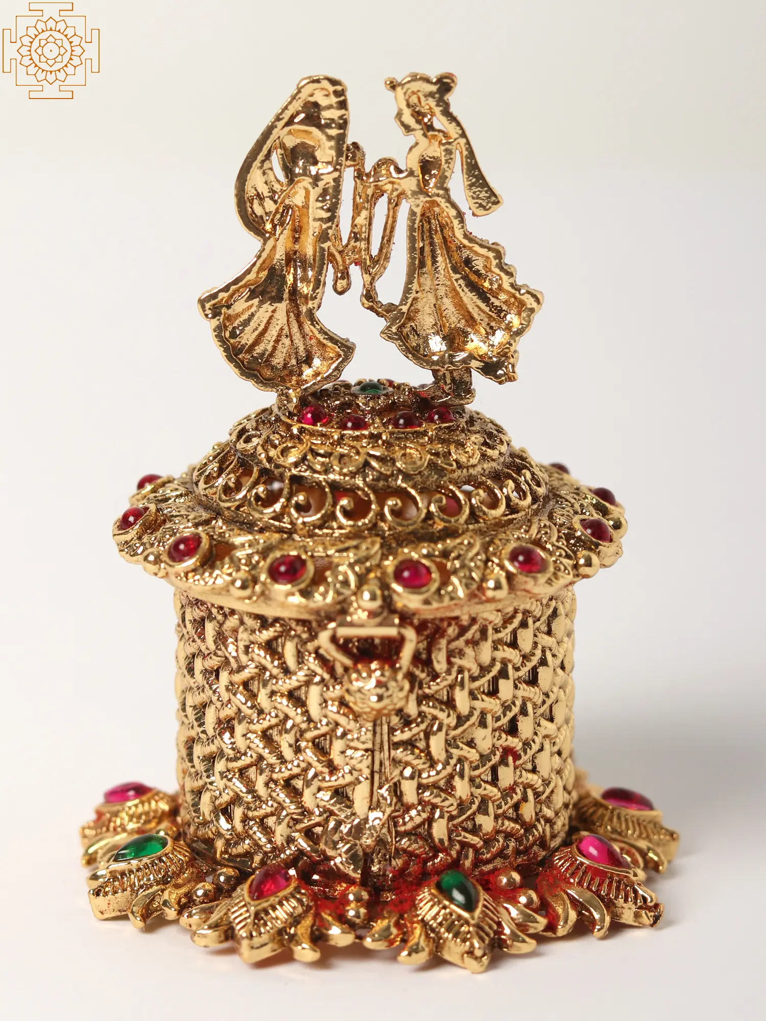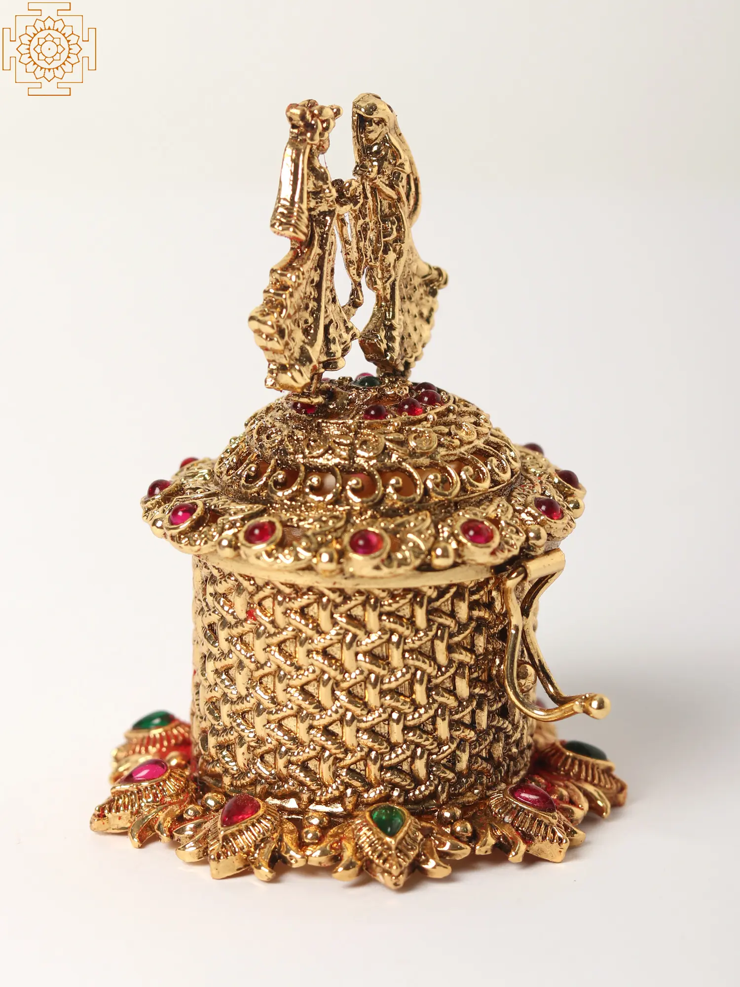 The beauty of this sindoor box lies in its intricate design. The lid is crowned with a captivating figurine of a couple, beautifully sculpted and detailed, showcasing the artistry of the creators. The box itself is a masterpiece of woven patterns and ornate detailing, with the golden brass subtly catching the light to create a shimmering effect. Each stone is carefully placed, enhancing the overall visual appeal and adding a touch of vibrant color. The attention to detail is undeniable, making this box a true collector's item and a testament to skilled craftsmanship.