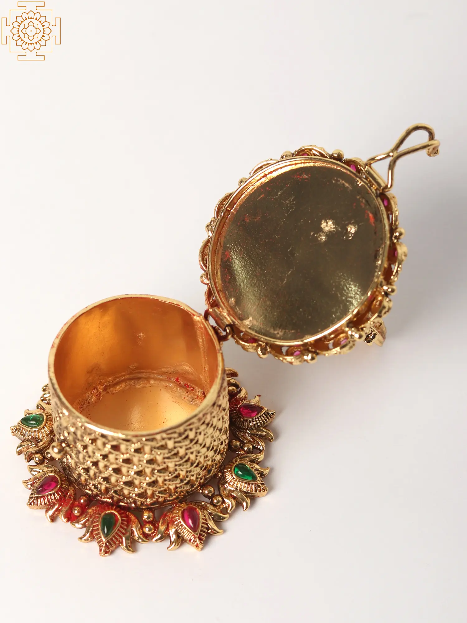 The vibrant hues of the embedded stones add a striking contrast to the golden brass. The carefully selected and precisely placed red and green gemstones enhance the ornate design, bringing a splash of color and life to the piece. This splash of color not only adds visual interest but also serves as a beautiful complement to the overall rich golden tones, resulting in a piece that is both sophisticated and captivating. The stones are securely embedded, ensuring durability and longevity.