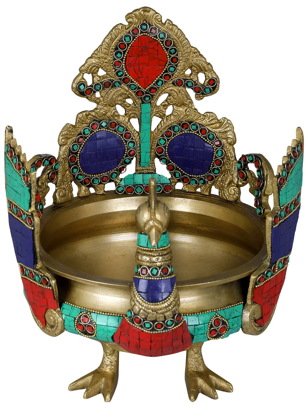 This peacock urli is crafted in a manner such that the large bowl in the centre forms the peacock’s body and a long neck protrudes out from the front, jewelled in gold treasures and multicolored reconstituted stones decorate the remaining surface; the two standing bars in triple layered colors on either side form the wings and the large structure at the back, carved in stylized ethnic designs is the charming tail of the peacock. Also have a look at the supporting legs of the urli, shaped like that of a peacock’s legs. Apart from its prioritized briefings of face features and other patterns, this statue is charmingly decorated in tri-colored reconstituted stones in an elegant and royal way.
