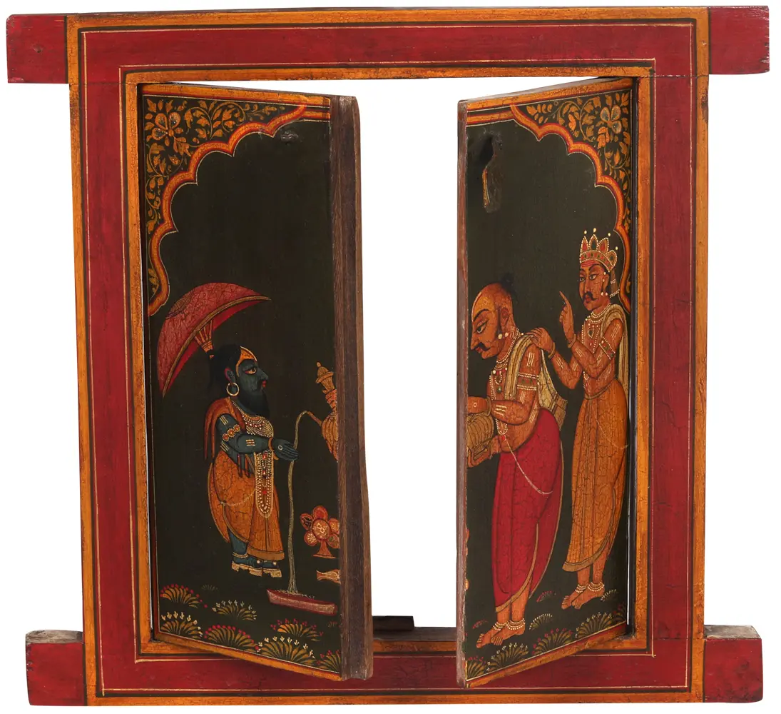 As per the famous ancient myth, the demon guru Shukracharya’s warning and advising King Bali not to donate three paces of land to the Vaman incarnate Lord Vishnu went in vain. Instead, Bali refused and Lord Vamana then measured the entire Brahamand only in two steps. Sensing trouble, Bali then pleaded with Vamana to put his third step on Bali’s head. This glorious hand-painted quality wooden jharokha window in glittering colors, depicting three characters- King Bali, Lord Vamana, and shukracharya, will stunningly beautify your interiors.