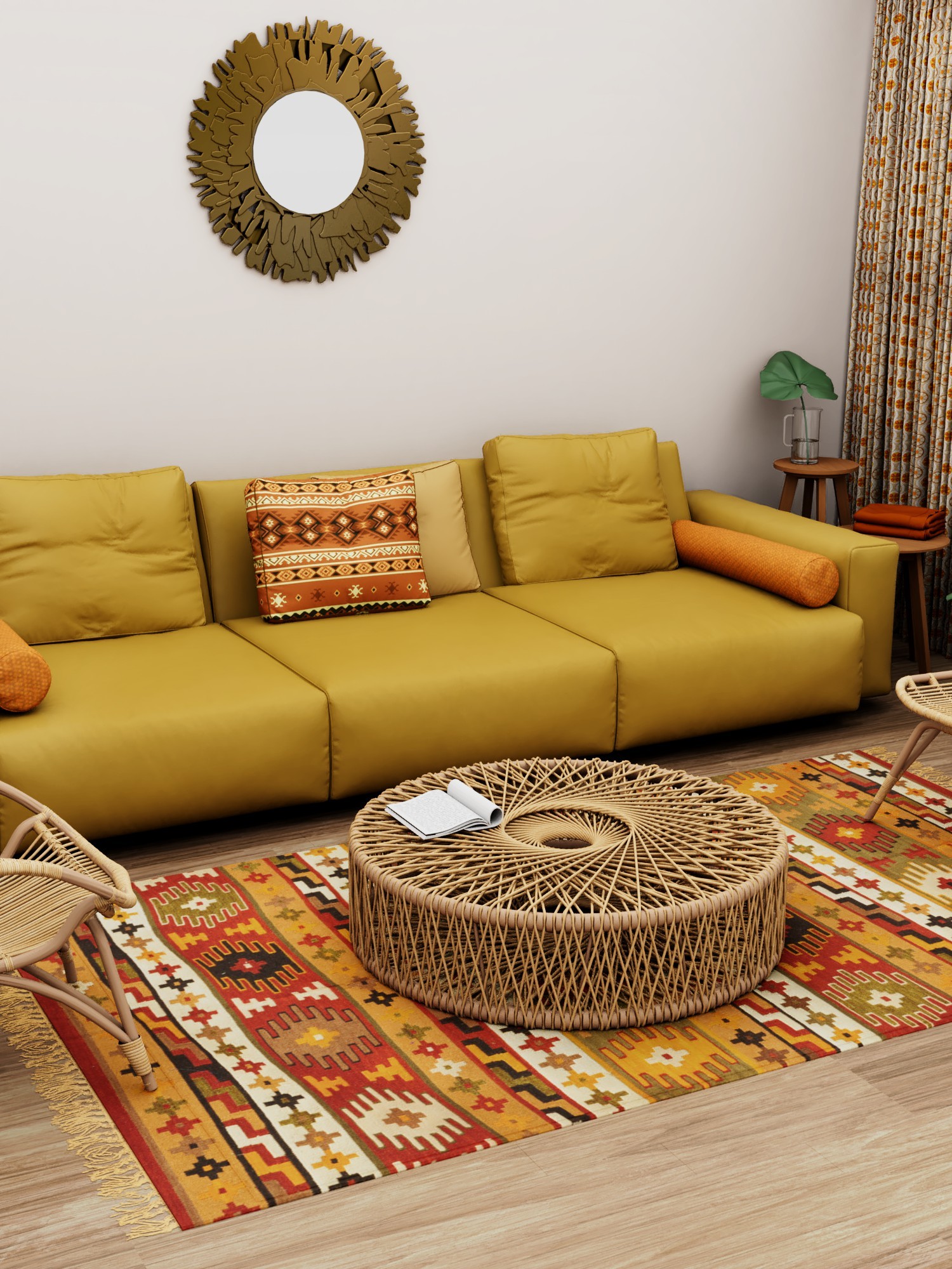 The all-over woven motifs create a captivating visual tapestry. The design is a harmonious blend of geometric patterns and stylized floral elements, presenting an artful composition that is both eye-catching and refined. The carefully chosen palette of earthy tones – warm reds, muted greens, golden yellows, and rich browns – evokes a sense of warmth and organic beauty. These colors work together to create a versatile piece that complements a wide range of interior styles. Whether your décor is bohemian, rustic, or modern, this rug will integrate seamlessly, adding texture and depth to your living space.