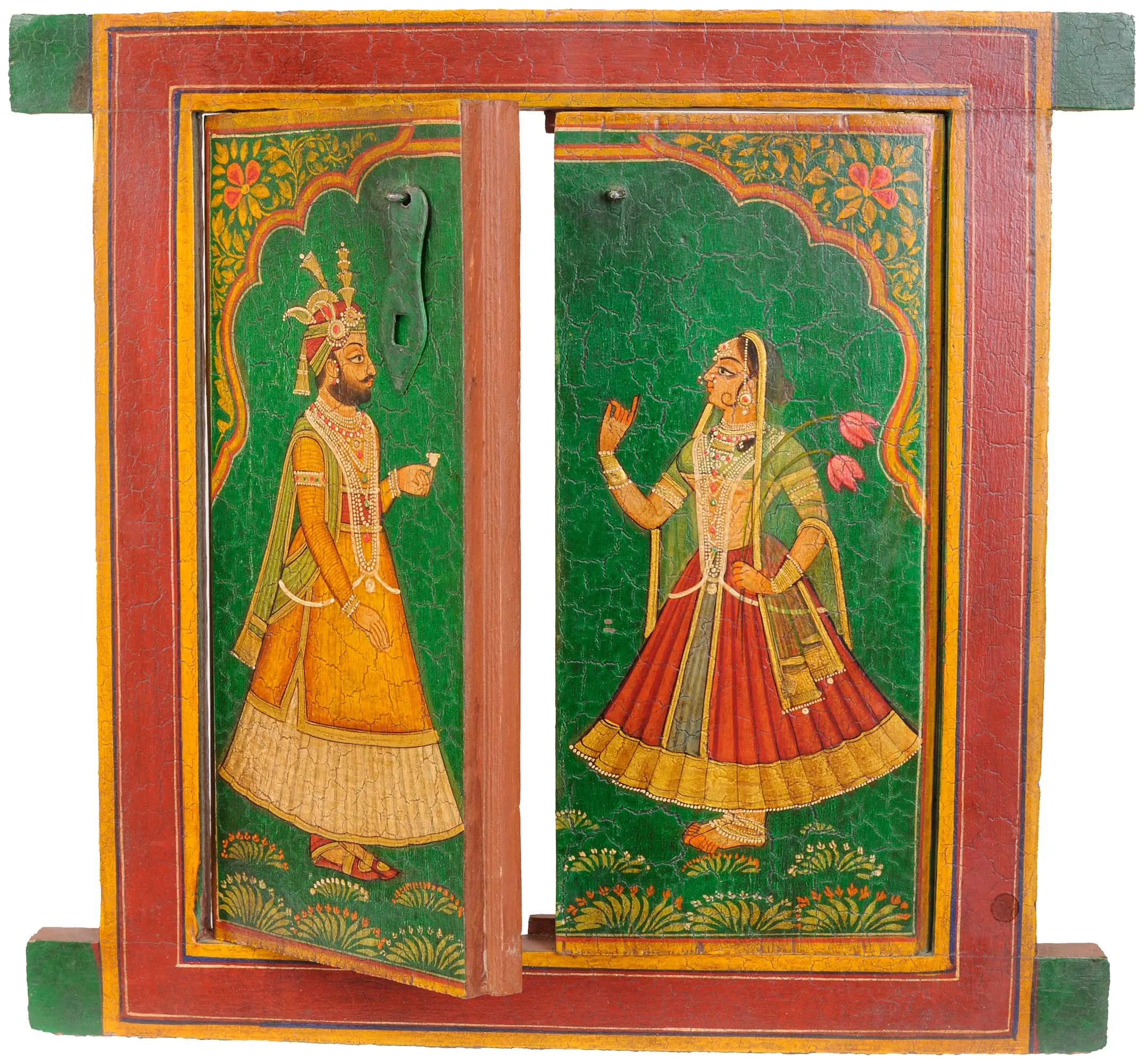 Capture the essence of regal artistry with this unique wooden window. More than just a decorative piece, this is a window into a world of kings and queens, of vibrant colors and intricate details, all meticulously hand-painted onto sturdy wood. Evoking the grandeur of Rajasthan, this piece brings an authentic touch of Indian heritage into your home. Imagine this window as a captivating focal point in your living room, bedroom, or study. Its presence will undoubtedly spark conversations and add a distinctive character to your decor. The scene painted upon the wood depicts a royal couple in traditional attire, rendered in a palette of rich colors that instantly grabs attention.
