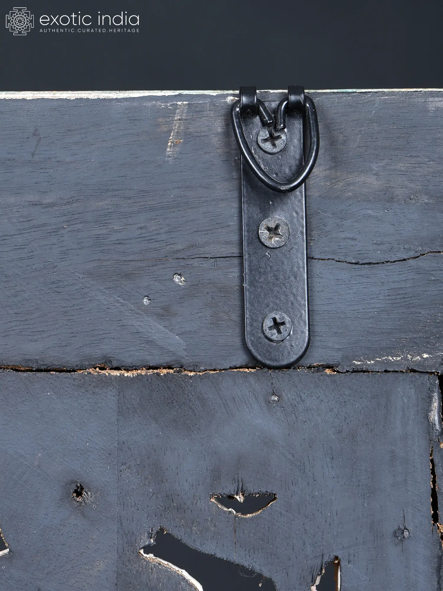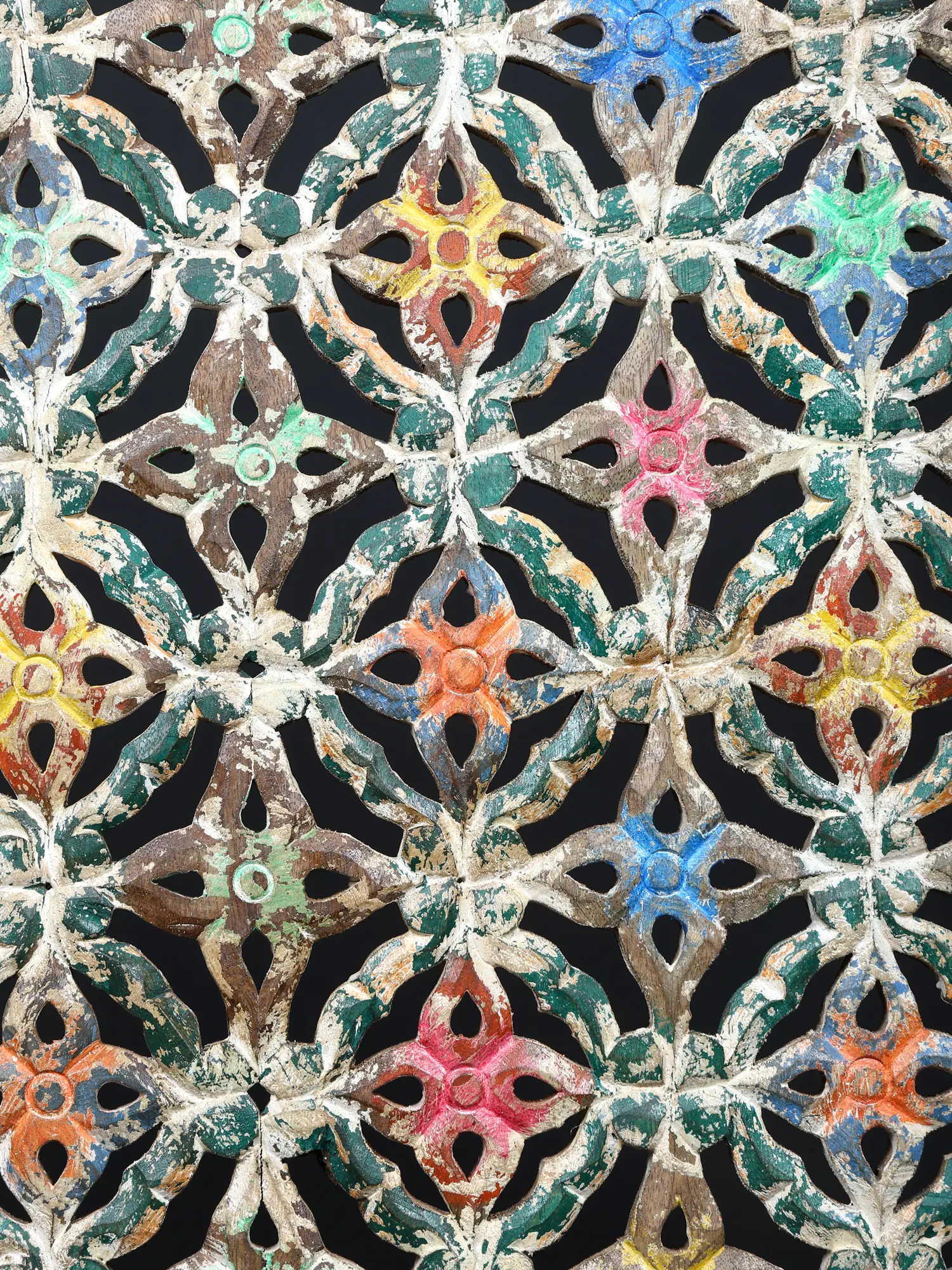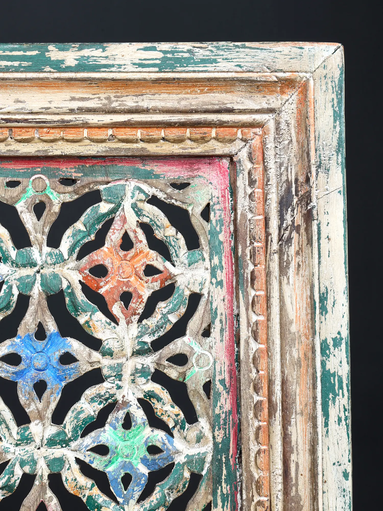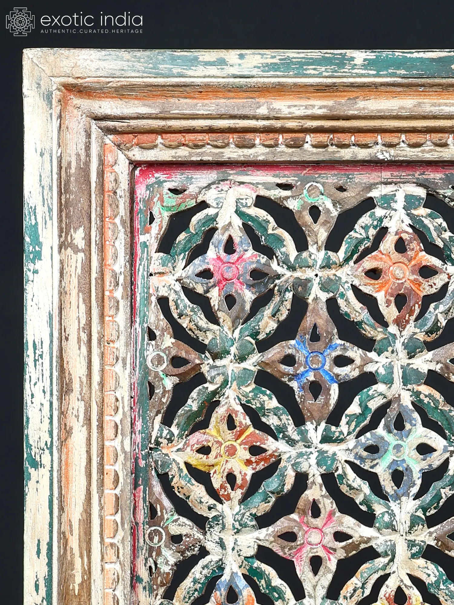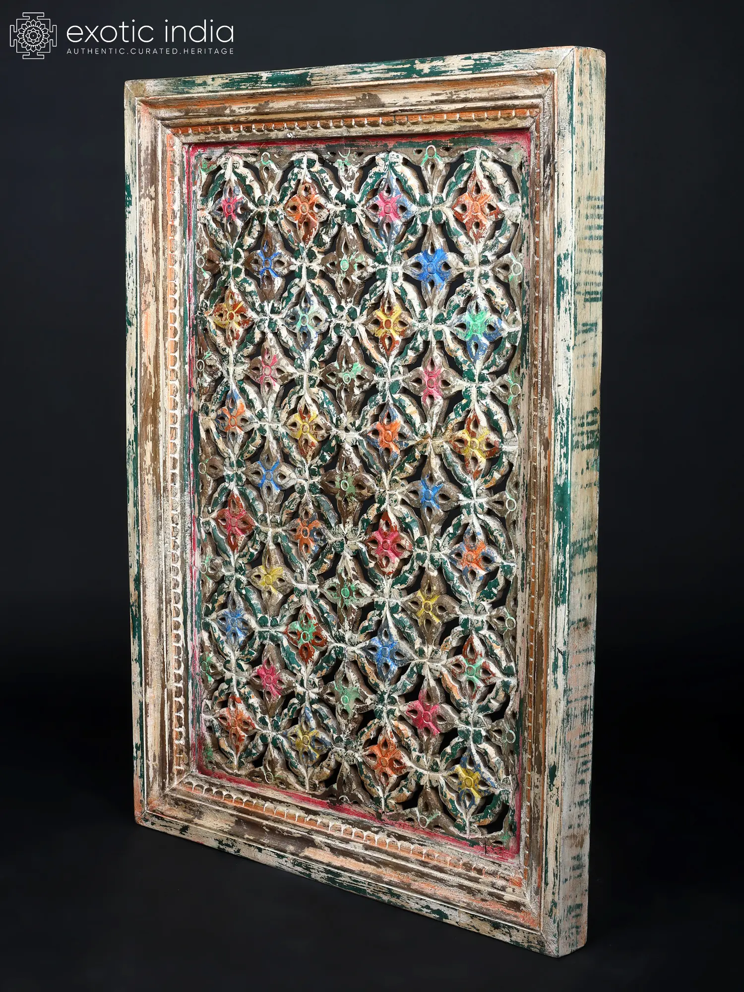 Each detail of this piece tells a story of skilled hands and generations of tradition. Carved from select wood, its robust frame encircles a meticulously designed jali pattern. The surface bears the marks of time, with distressed finishes and subtle pops of vibrant color that speak to its artisanal journey.