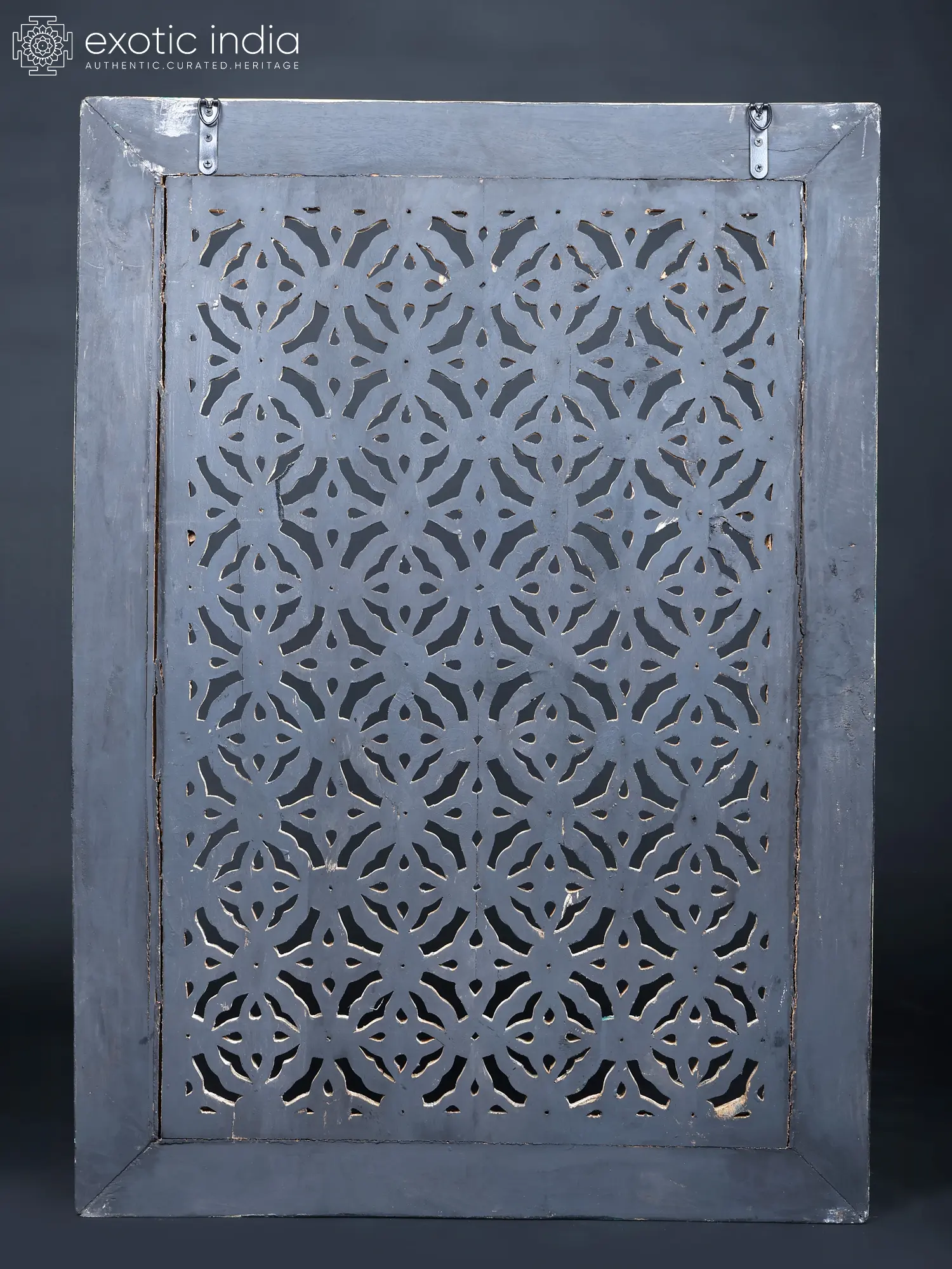 Features an intricate, geometric jali pattern carved from wood.