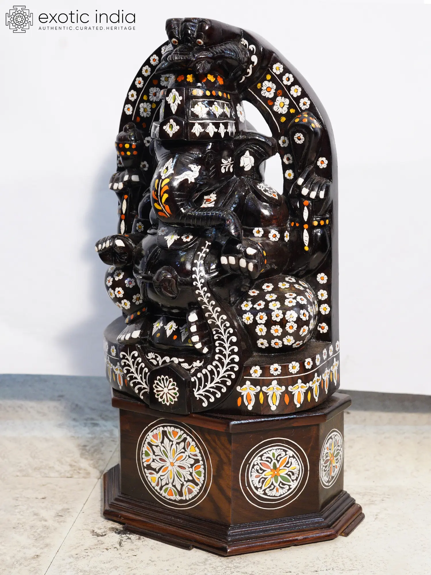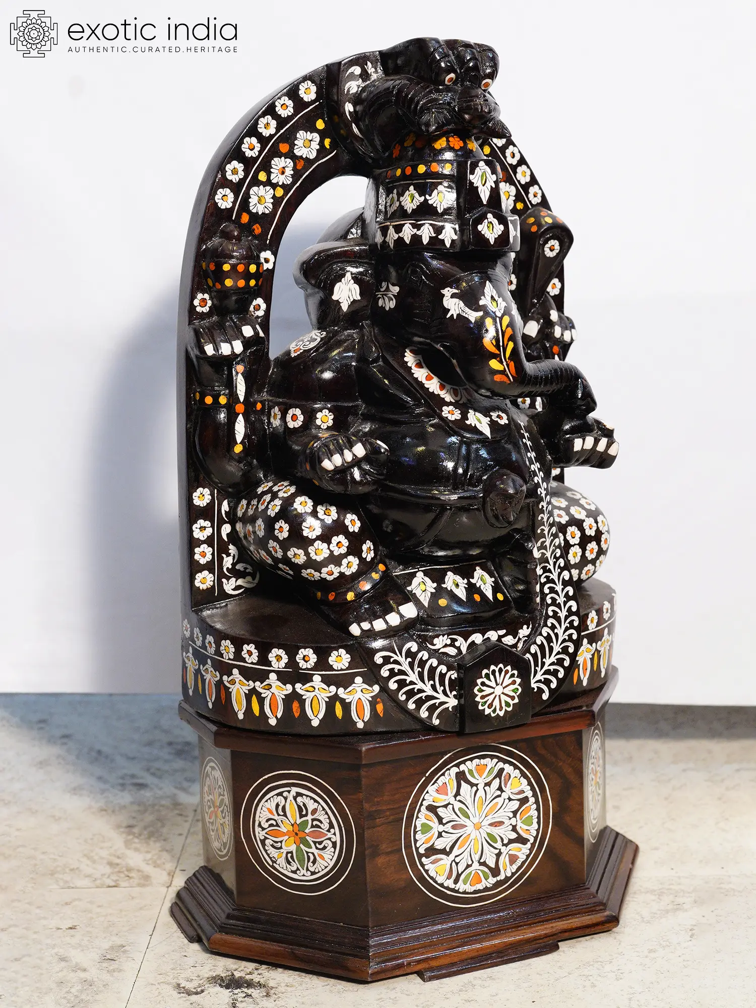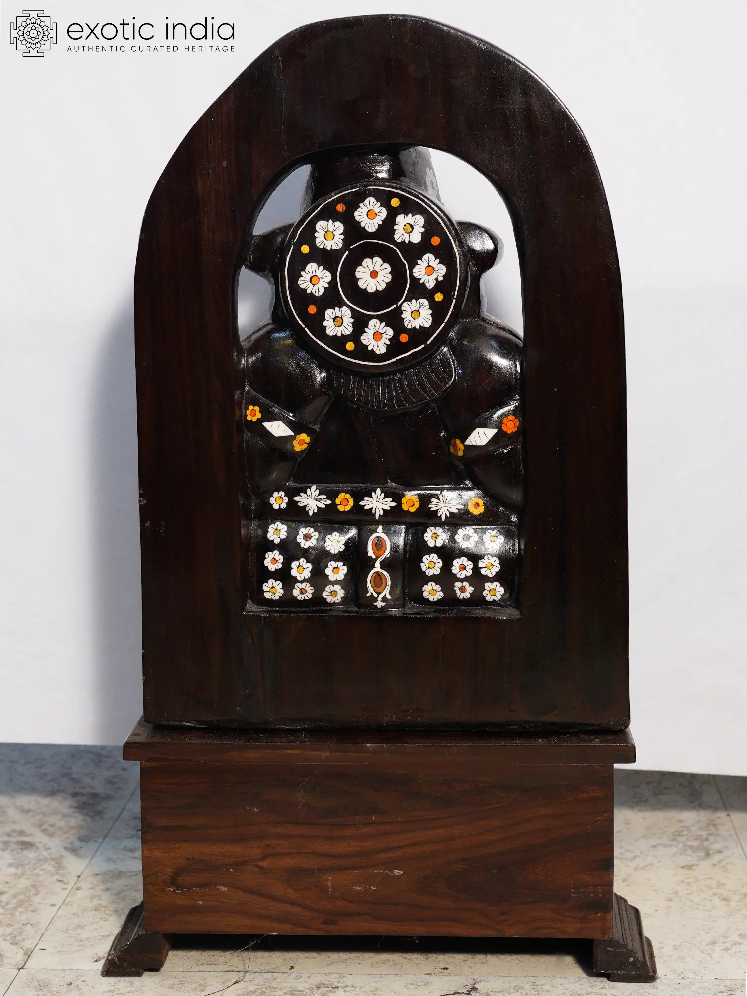 The true marvel lies in the exquisite inlay work, featuring delicate floral motifs rendered in contrasting materials. These vibrant accents, appearing as scattered blossoms and graceful vines, are precisely set into the dark rosewood, creating a stunning visual dialogue. The form itself is rendered with a dignified presence, each hand extended in a gesture of blessing or contemplation. The supportive base, also crafted from rosewood, features circular medallions of intricate inlay, mirroring the decorative theme.