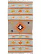 The rug features a captivating interplay of light-blue and orange hues, creating a lively yet harmonious visual experience. The woven stripes provide a structured foundation, while the intricate motifs add a layer of artistic complexity. Small touches of navy and gold add visual interest. The overall design exudes a sense of warmth and sophistication, making it a versatile accent piece for various interior styles. Whether your décor is modern, bohemian, or eclectic, this dhurrie will seamlessly integrate, adding a touch of global charm. The tasseled edges give the piece a classic look.