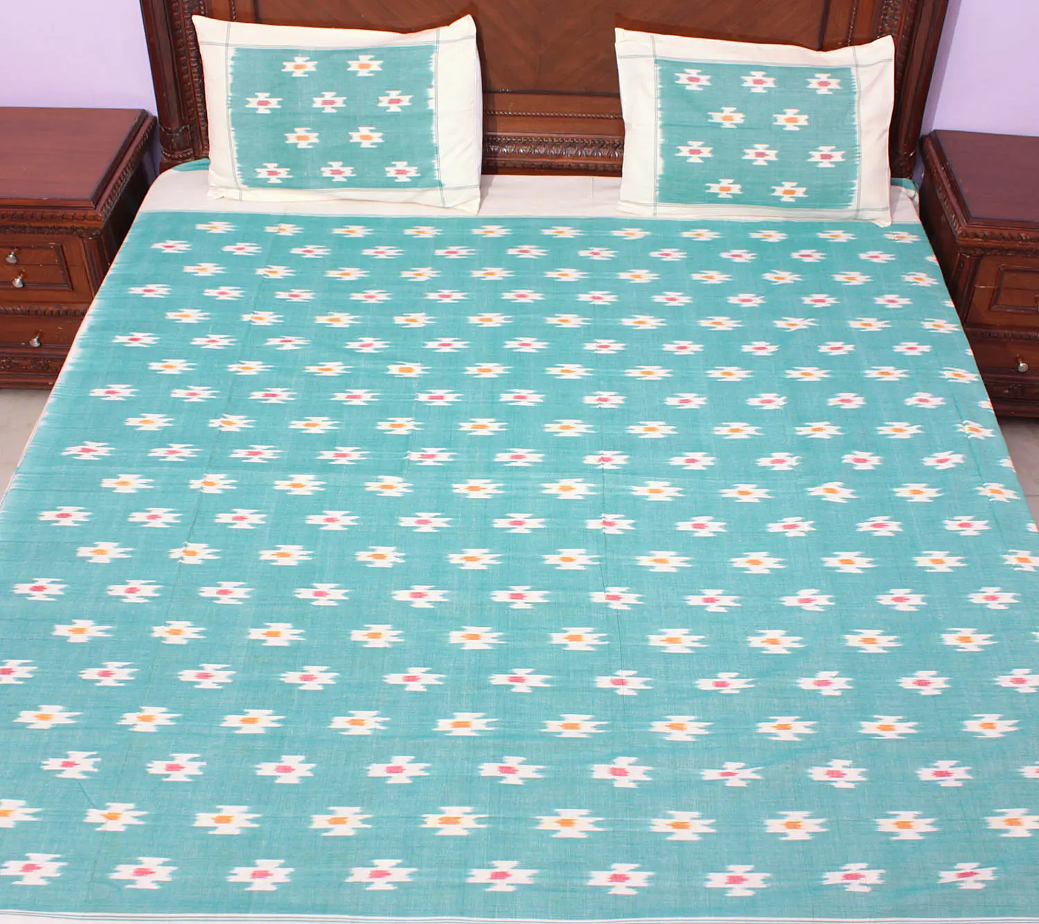 Originating from the village of Pochampally, India, this bedspread is a true embodiment of the region's rich textile heritage. Pochampally is renowned for its unique Ikat weaving style, characterized by its vibrant colors, geometric patterns, and the mesmerizing blurriness that results from resist-dyeing the threads before weaving. Owning this bedspread means owning a piece of this cultural legacy, supporting the artisans who keep this traditional craft alive, and bringing the warmth and charm of Pochampally into your home.