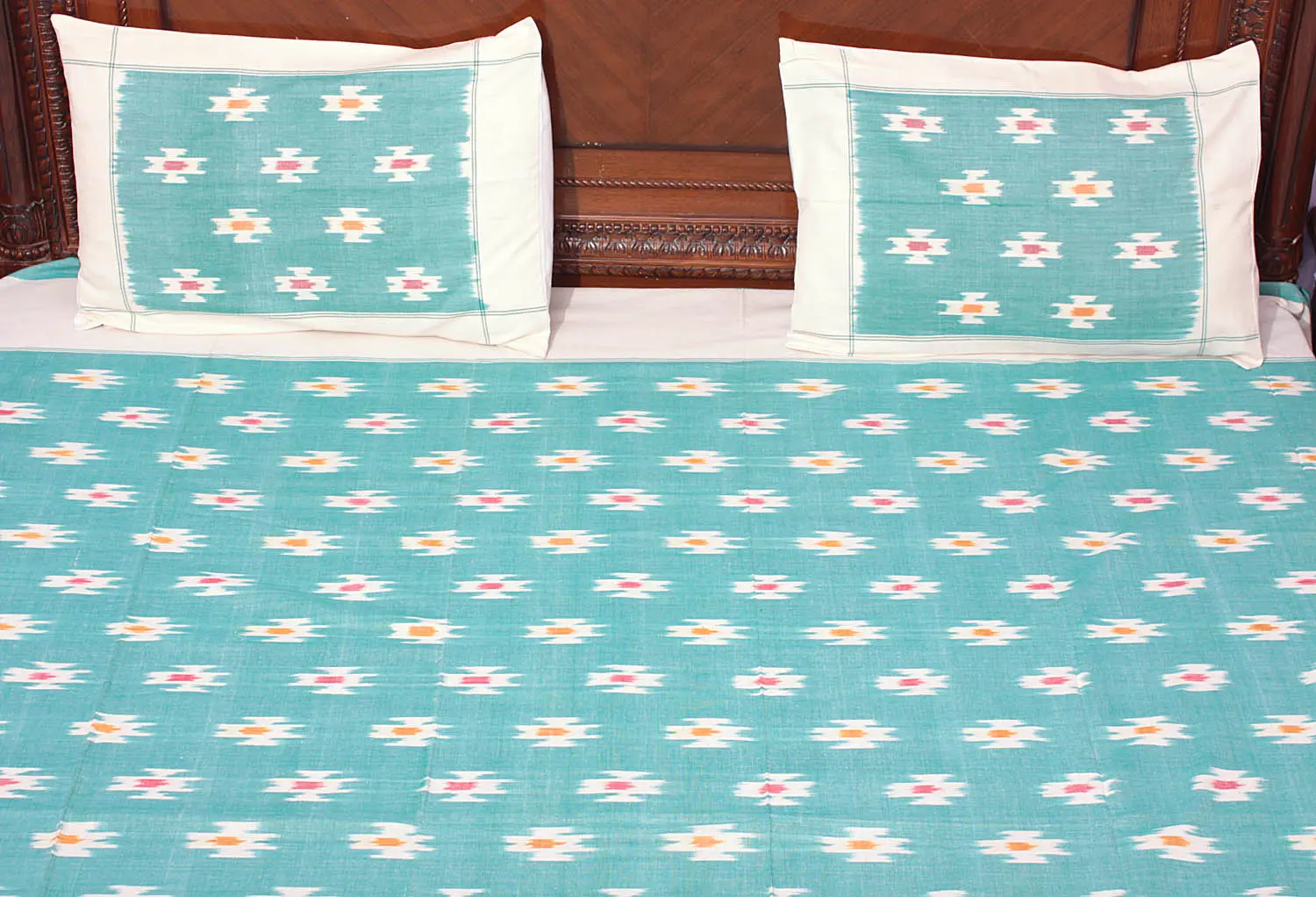 Queen Size Ikat Woven Bedspread with Pillow Cases - Cotton Geometric Design