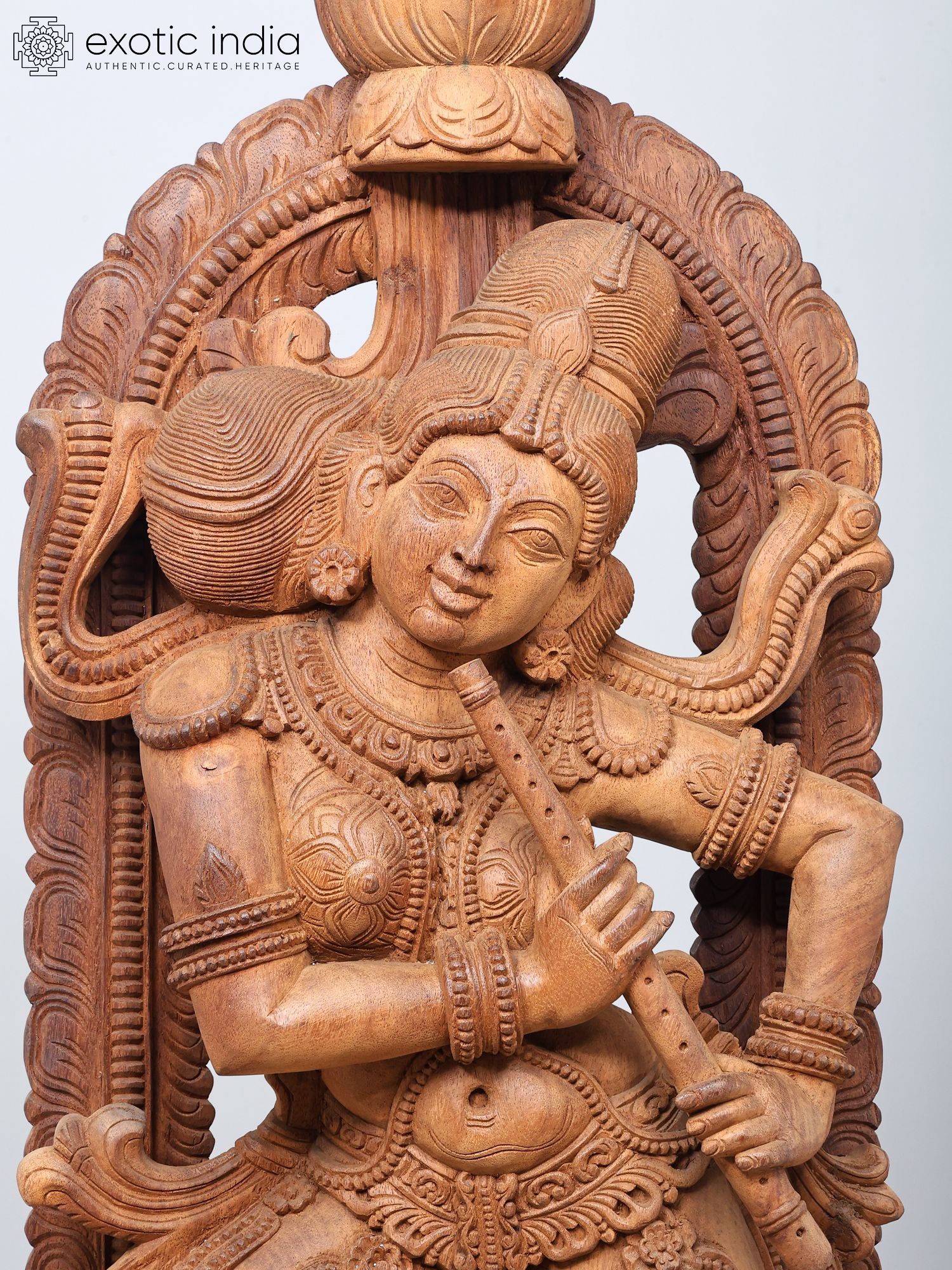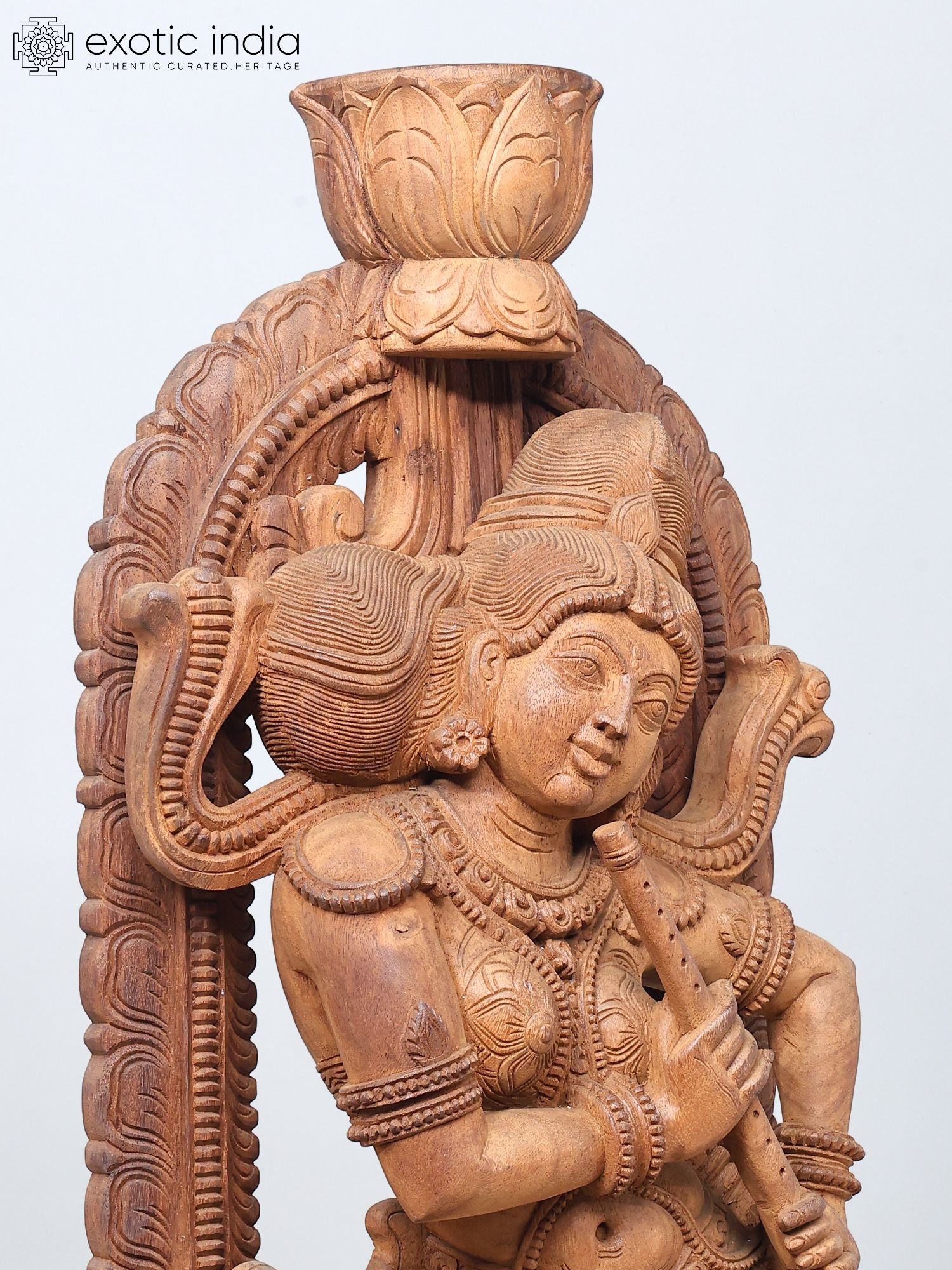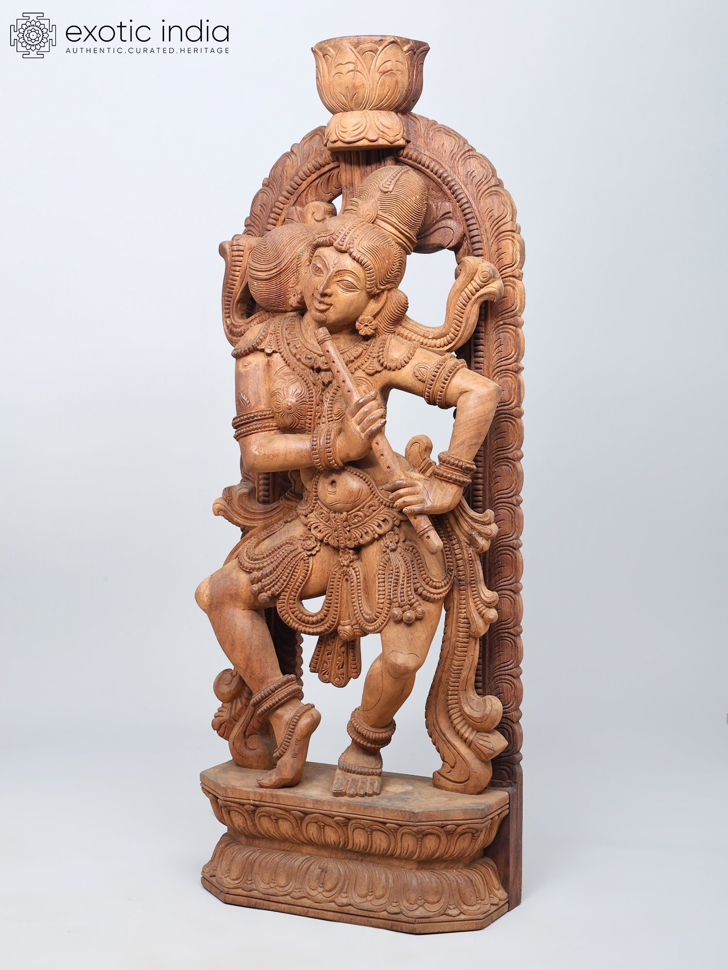 Madanika (Temple Dancer) with Flute in Tribhanga – South Indian Style Wooden Statue