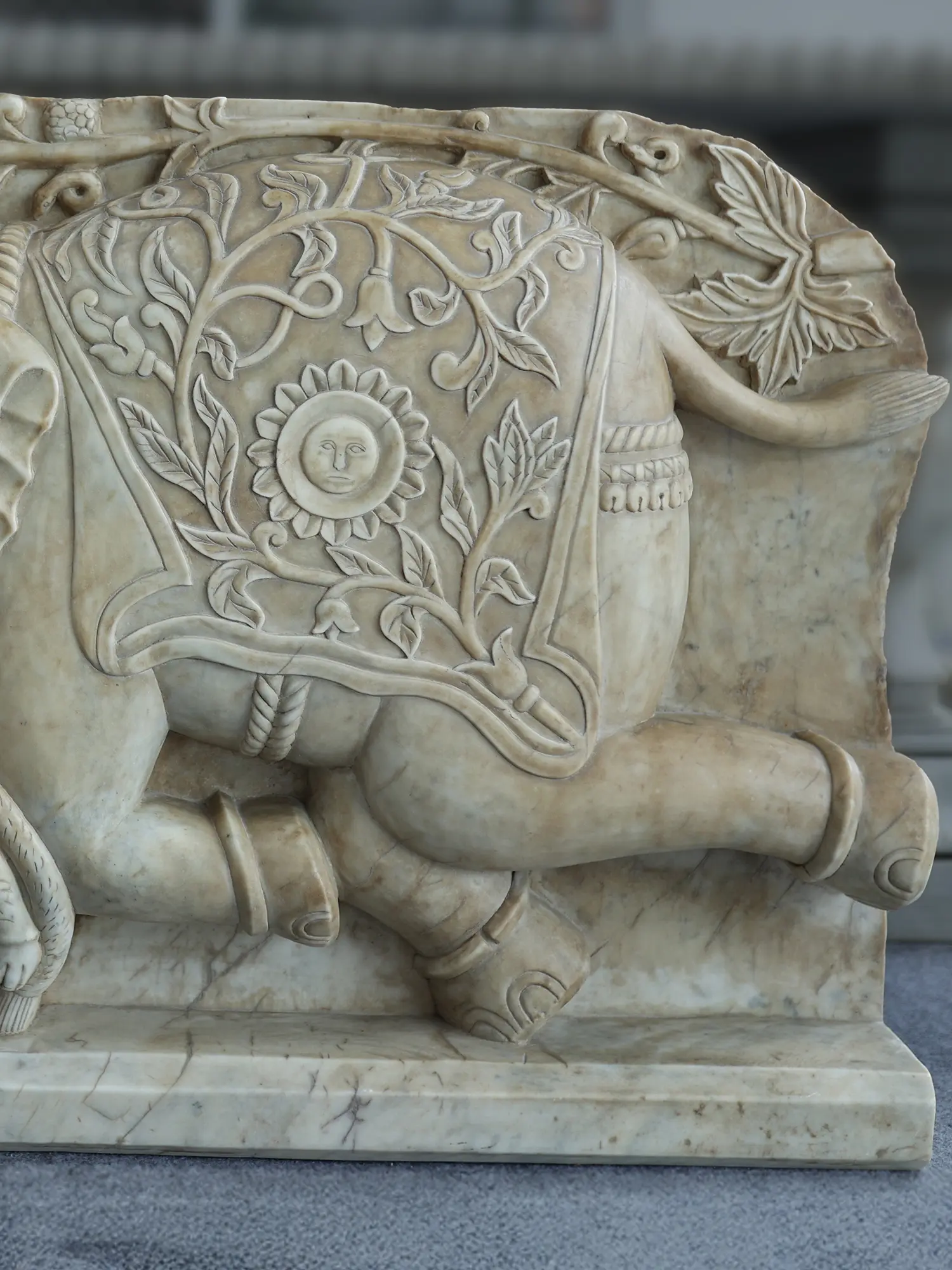 Equally compelling is the ornamental world that surrounds the struggle. Vines, foliage, and floral motifs spread across the surface with remarkable naturalism, softening the violence of the hunt and situating it within a larger cosmic order. The sun motif and the richly patterned cloth draped over the elephant assert royal legitimacy, linking the act of the hunt to solar lineage, sovereignty, and ritual affirmation.
