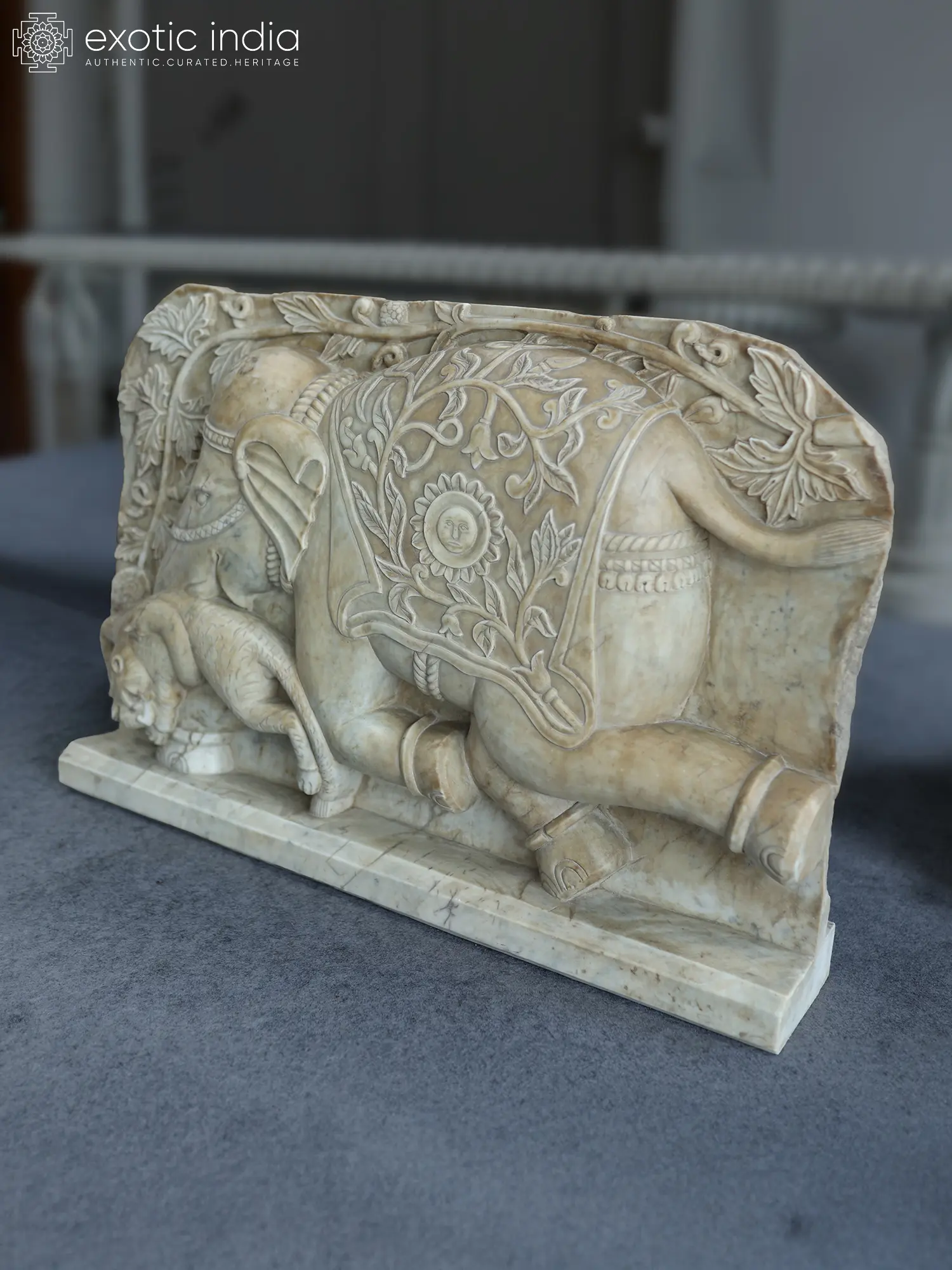 This relief draws its strength from movement held in stone. The elephant, an ancient symbol of royalty, is depicted as a living force caught mid-action. Its body leans forward with weight and intent, muscles tightening beneath the carved skin, legs advancing with a sense of inevitability.